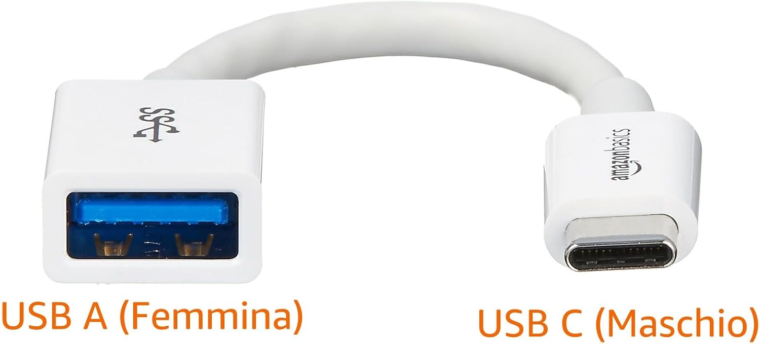 Dai un’occhiata a il prodotto Amazon Basics Cavo convertitore da USB-C a USB-A 3.1 Gen 1 adattatore femmina, velocità 5 Gbps, certificazione USB-IF, per laptop, tablet, telefoni, bianco, perfetto per chi cerca qualità e convenienza.