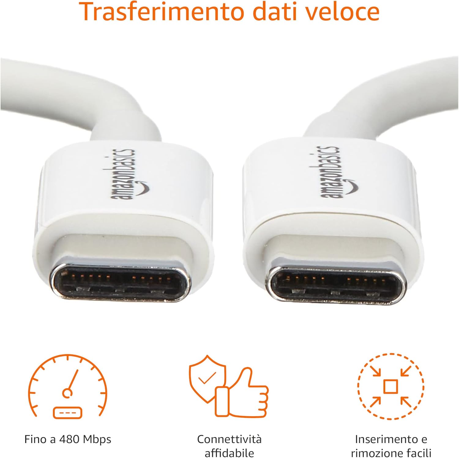 Amazon Basics Cavo di ricarica rapida da USB-C a USB-C, velocità 480 Mbps, certificato USB-IF, per ricarica rapida Apple iPhone 16/15, iPad, MacBook, Samsung Galaxy, tablet, laptop, 1.8 m, bianco