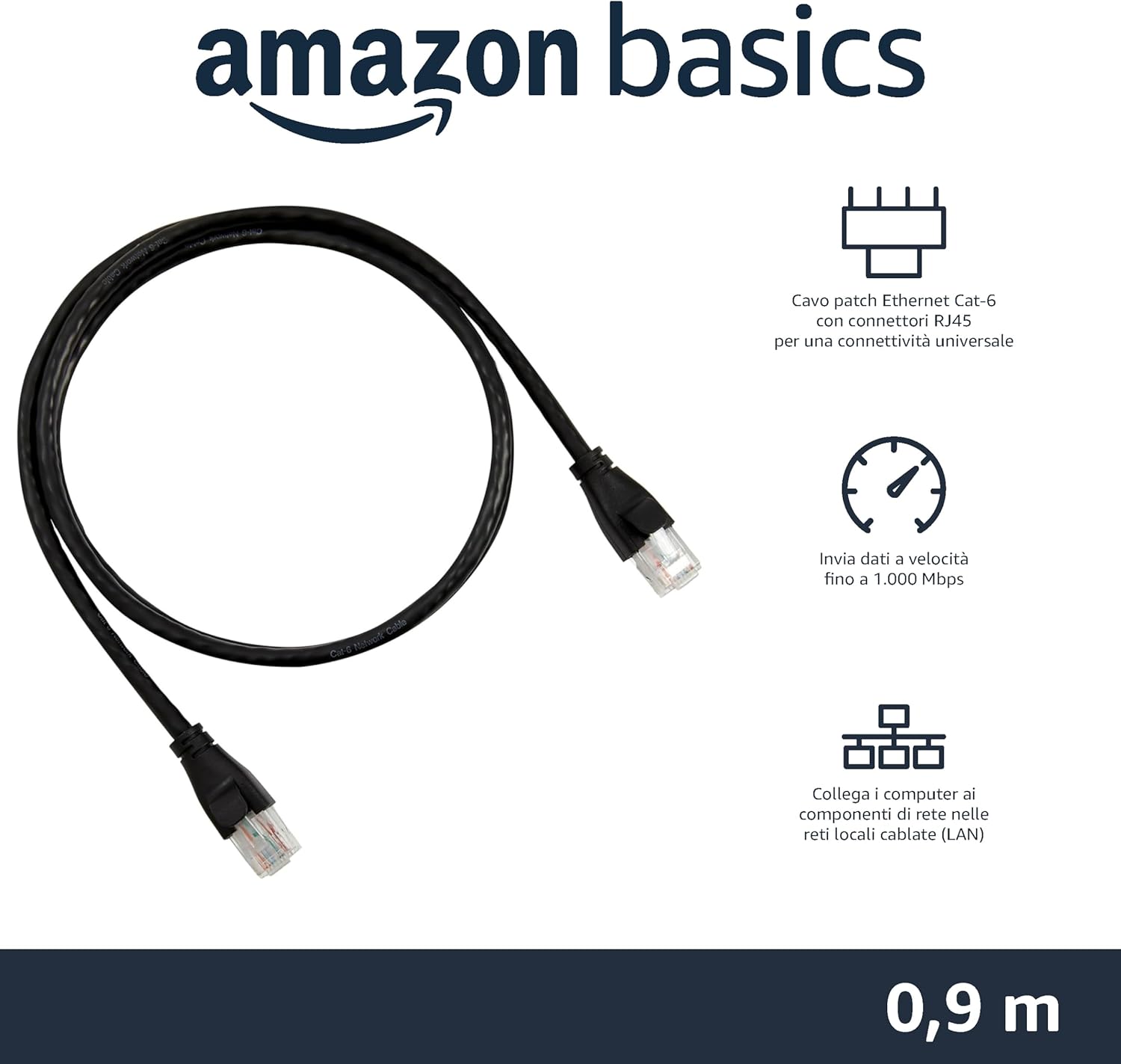 Scopri il prodotto Amazon Basics Cavo patch Ethernet CAT6, con connettori RJ45, LAN, Gigabit, ideale per reti domestiche e aziendali, 0.91 m (confezione da 1), Nero, adatto per chi cerca qualità e convenienza.