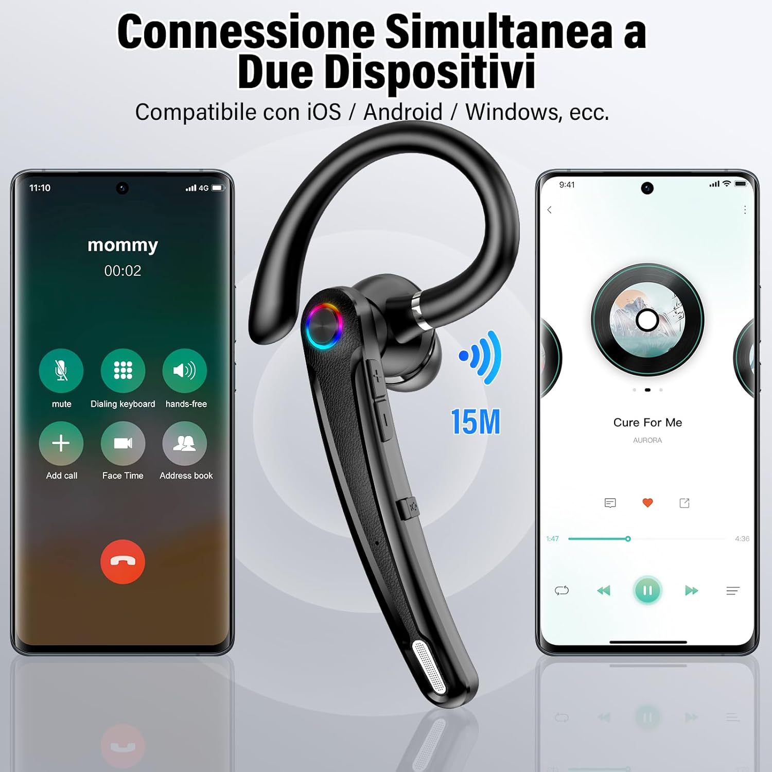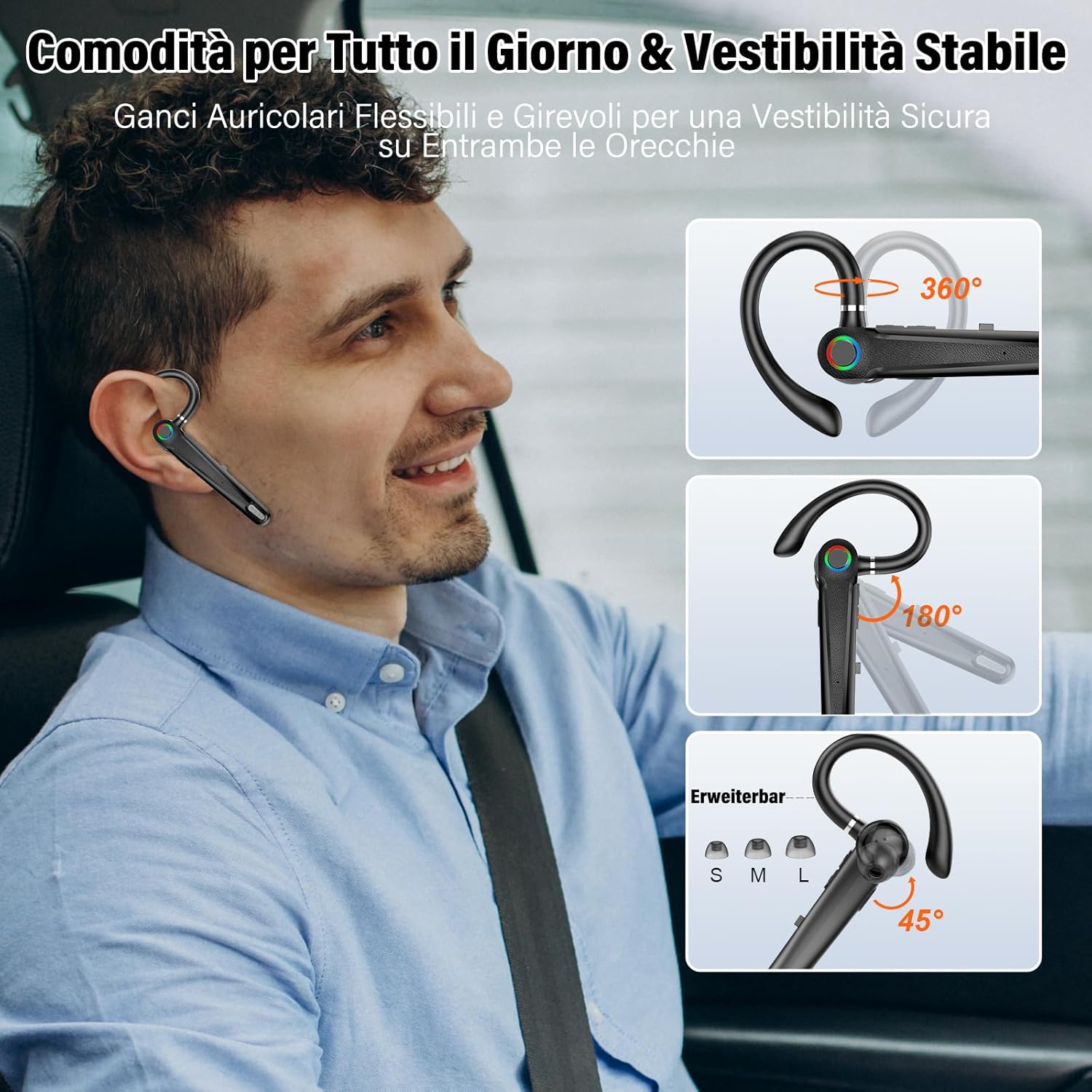 Atheewon Auricolare Bluetooth, 120 Ore Conversazione Auricolari Bluetooth 5.4, Cuffie Wireless con Microfono Antirumore, Cuffie Bluetooth Singolo con Gancio Girevole per Guida/Lavoro/Business, Nero