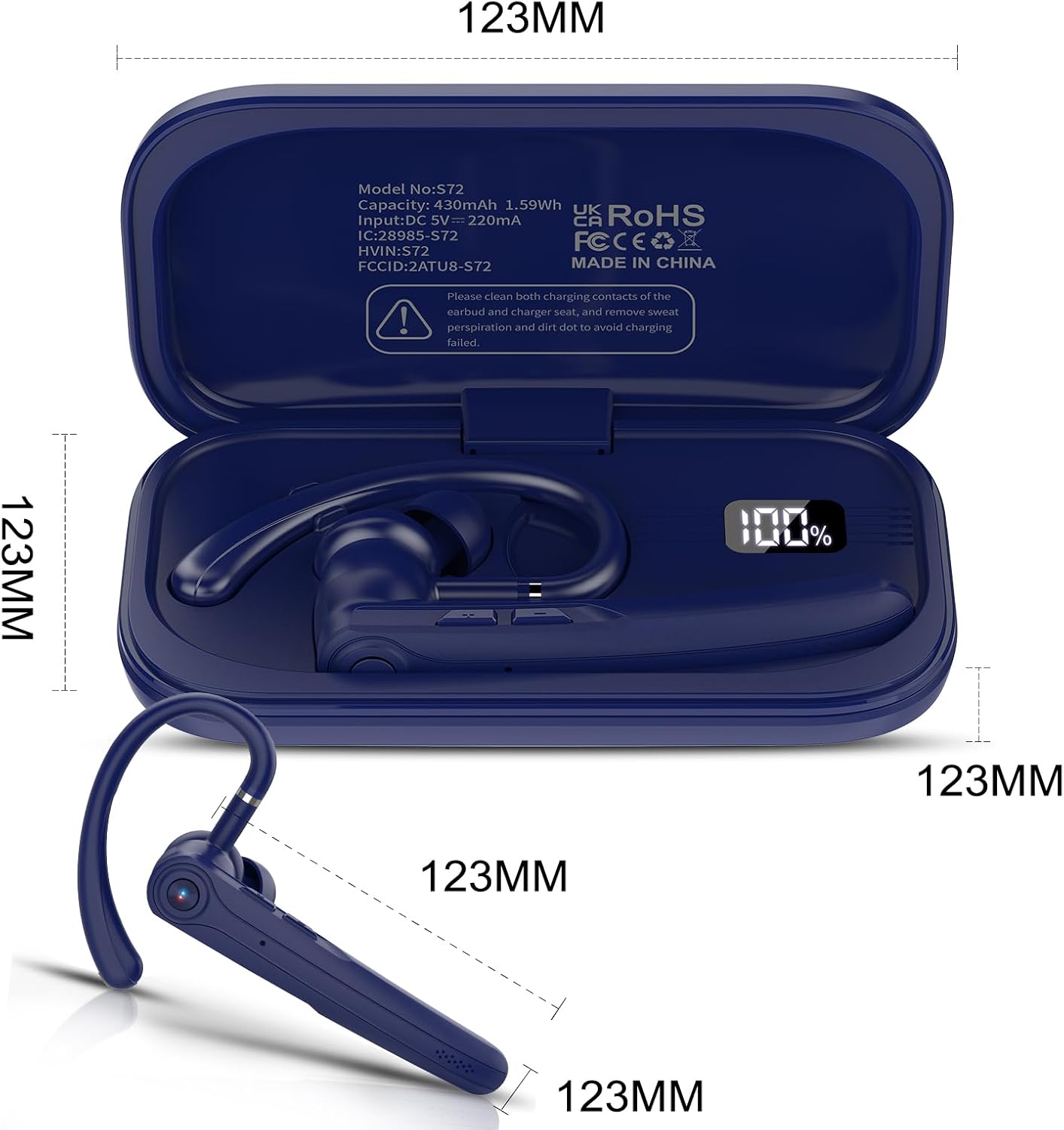 Auricolare Bluetooth Singolo con CVC8.0 e ENC Doppio Microfono V5.4 Auricolari Bluetooth con 25 Ore Di conversazione, 180 Ore di Standby, Cuffie con Gancio Girevole per Guida/Lavoro/Ufficio, Blu