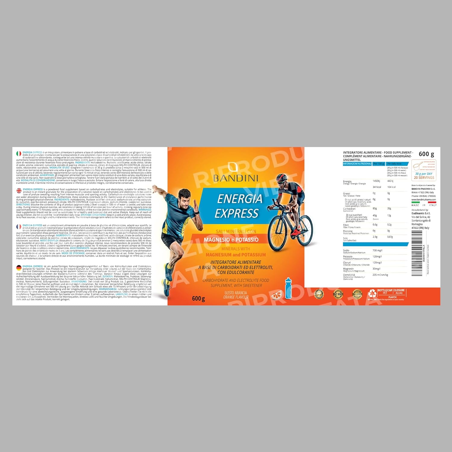 Bandini® Energia Express (MAGNESIO E POTASSIO) 600g Polvere, Sostiene l’organismo con i Sali Minerali, Integratore Alimentare a base di Carboidrati ed Elettroliti con Zuccheri, Palestra ed Allenamento