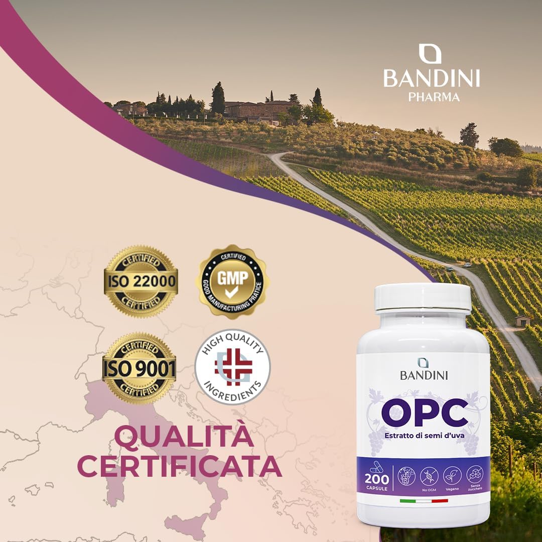 Bandini® Integratore OPC (95%) Estratto Semi d’Uva + Vitamina C, 200 capsule Vegane, OPC Puro da Uva Italiana con Contenuto più Alto Secondo HPLC, Antiossidante, Proantocianidina Oligomerica 95%