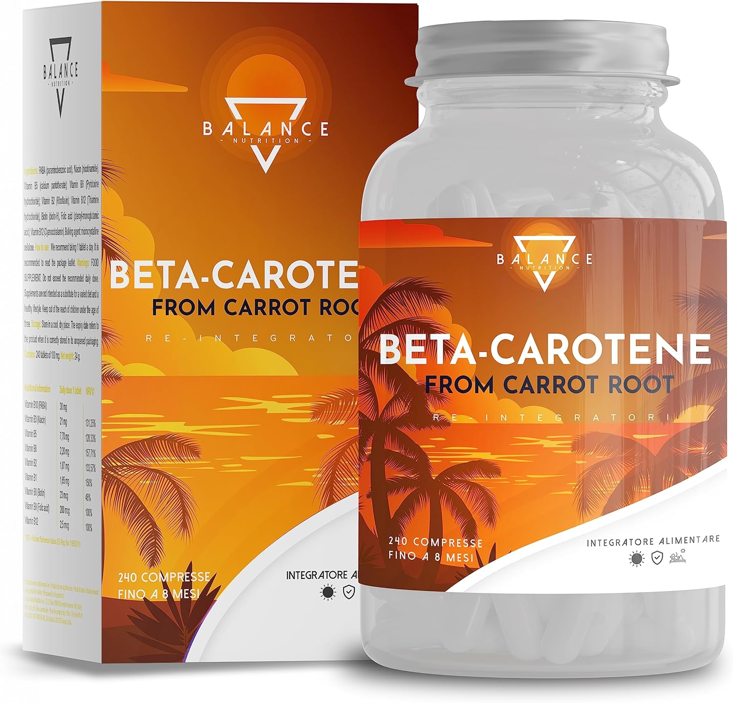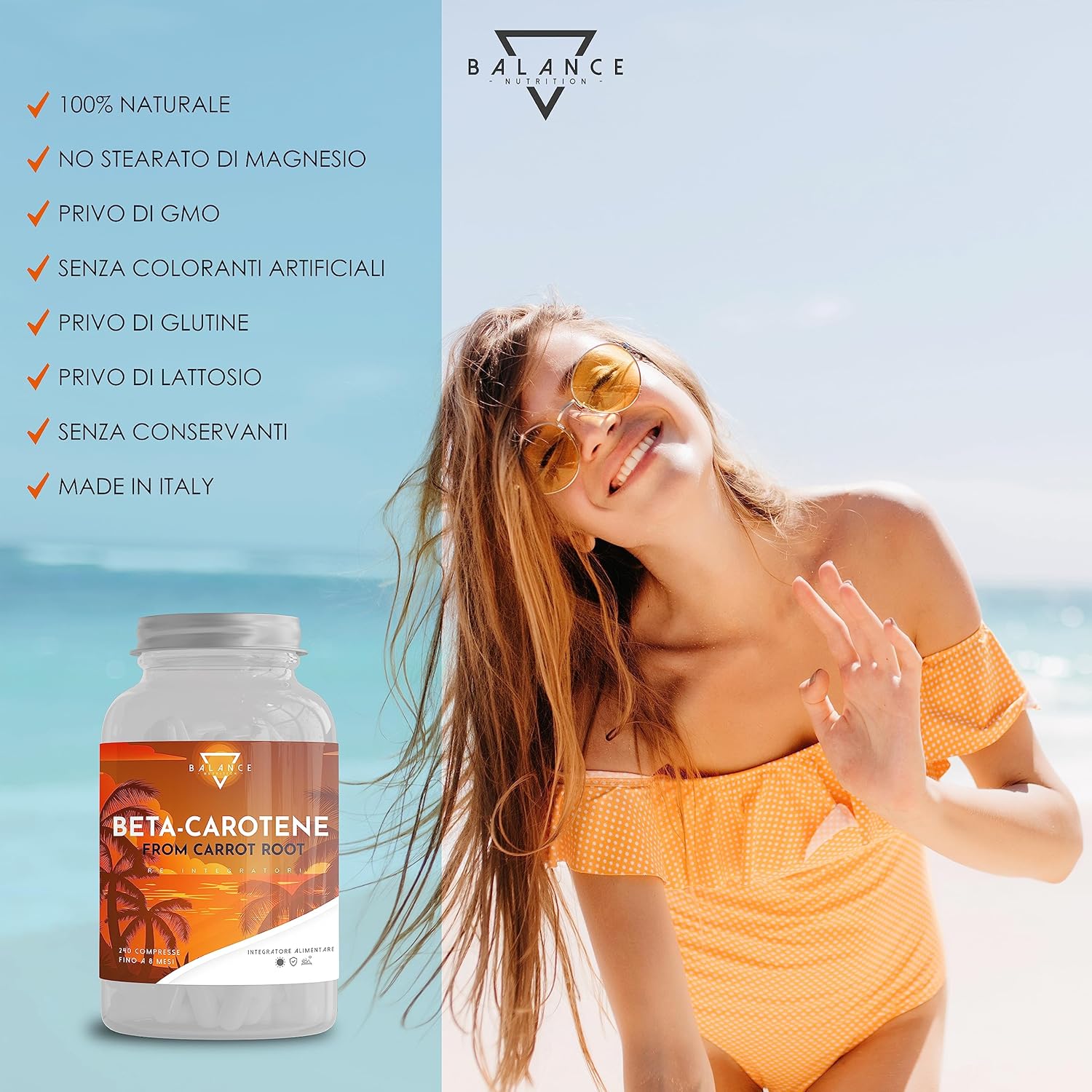 BETACAROTENE ABBRONZATURA FORTE – 240 COMPRESSE (Scorta 8 mesi) | Betacarotene per Abbronzatura Forte | da Estratto di Carota | Integratore Melanina Naturale | Made in Italy