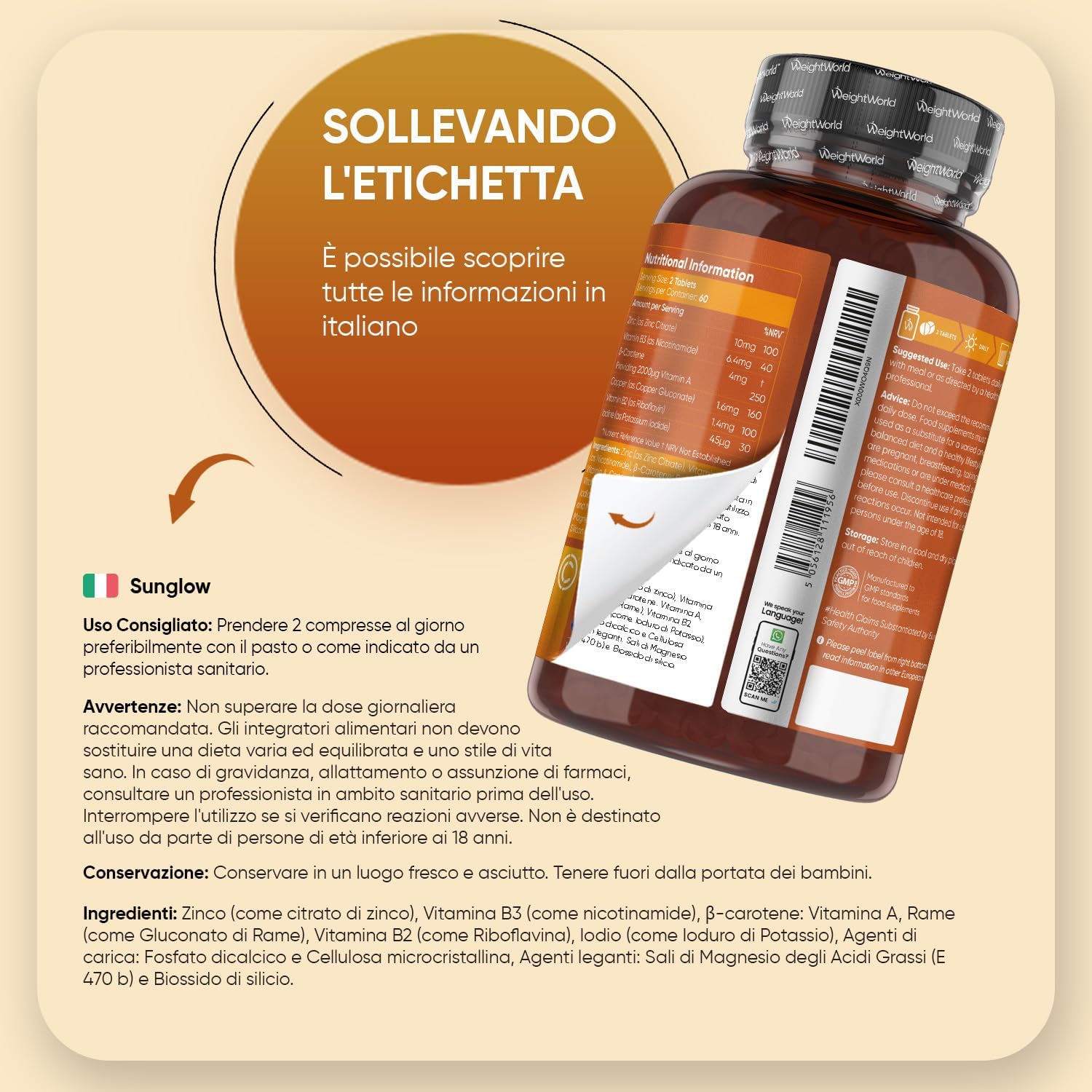 Betacarotene per Abbronzatura Forte, 120 Betacarotene Compresse Vegan, Vitamina A 2000 mcg, Zinco, Vitamina B2, Vitamina B3, Iodio, Rame Integratore, Integratore Abbronzatura, Betacarotene Integratore