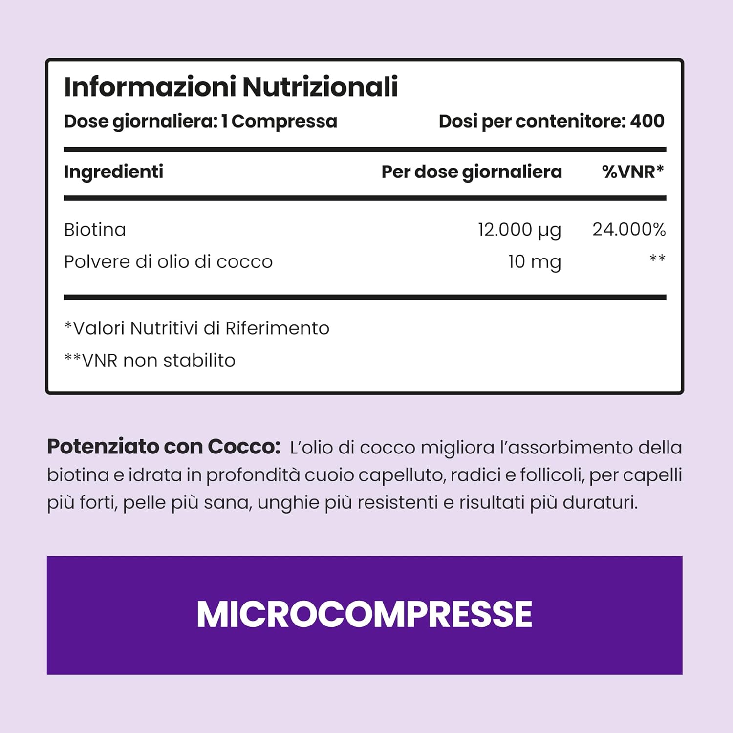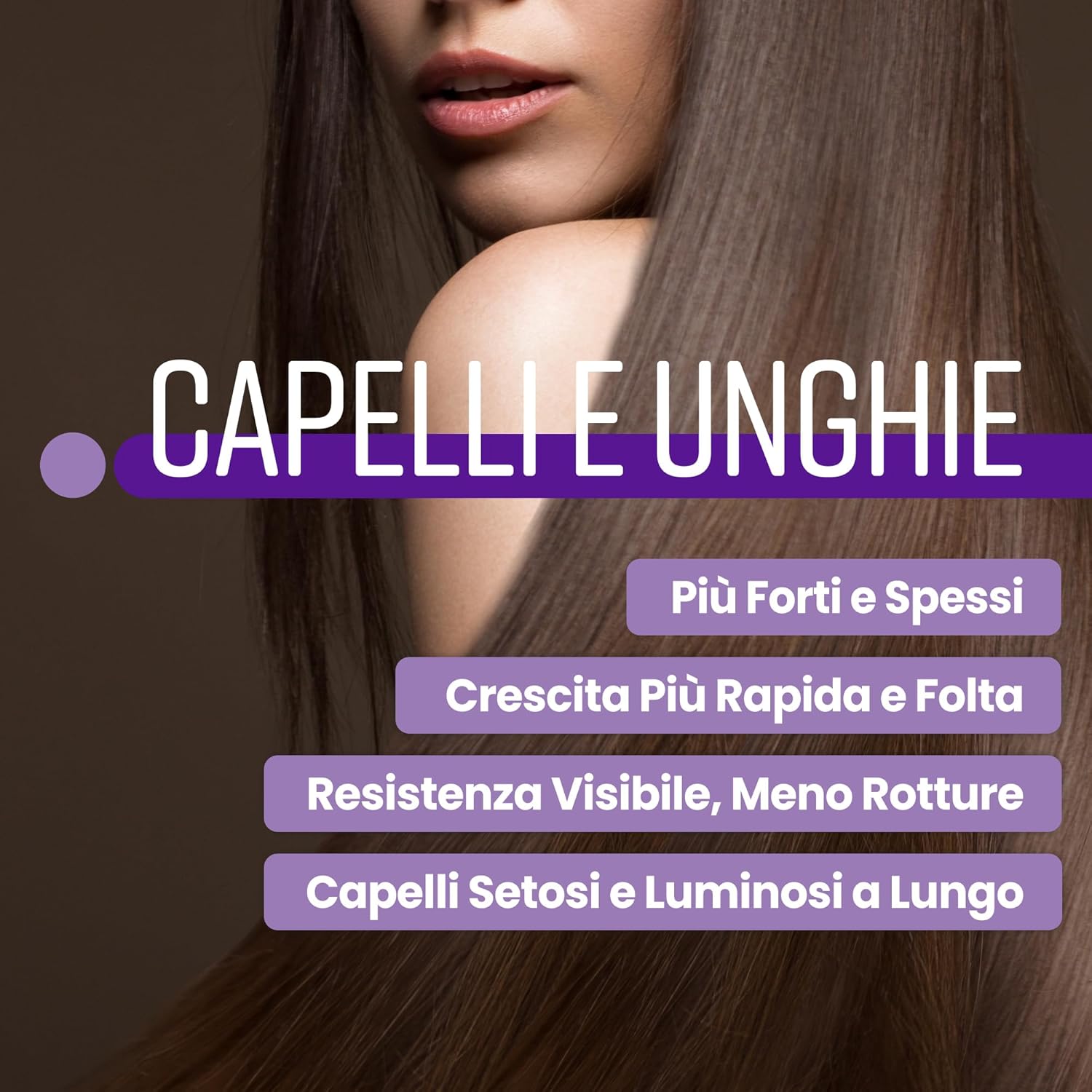 Questo integratore contiene una dose piuttosto alta di biotina (12.000 µg), che è nota per favorire la crescita e la salute dei capelli, delle unghie e della pelle. Oltre alla biotina, gli ingredienti includono vitamine del gruppo B, particolarmente la B7, che gioca un ruolo cruciale nel mantenimento di capelli sani e lucenti. Ho notato un miglioramento nella brillantezza dei miei capelli e una leggera riduzione della caduta. Tuttavia, per risultati ottimali, è consigliabile seguire una dieta equilibrata.