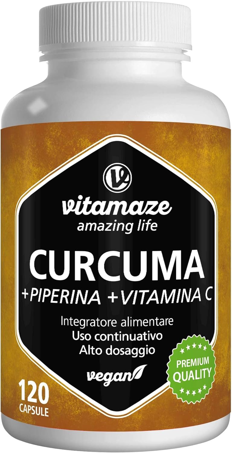 Dai un’occhiata a il prodotto Curcuma e Piperina Plus 1440 mg con Vitamina C ad Alto Dosaggio, L’Estratto 95% da Curcumina e Piperina Pura, 120 Curcuma Capsule Vegan, Turmeric Curcumin. Qualità Tedesca. Vitamaze®, perfetto per chi cerca qualità e convenienza.