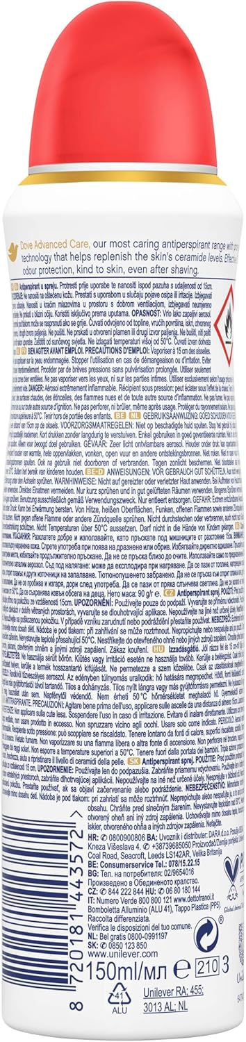 Dove Deodorante Spray Advanced Care Go Fresh Pesca, con Formula Idratante e Delicata sulla Pelle, Senza Alcol, Pelle Asciutta Fino a 72 Ore, Deodorante Uomo e Donna, 6 Pezzi da 150ml