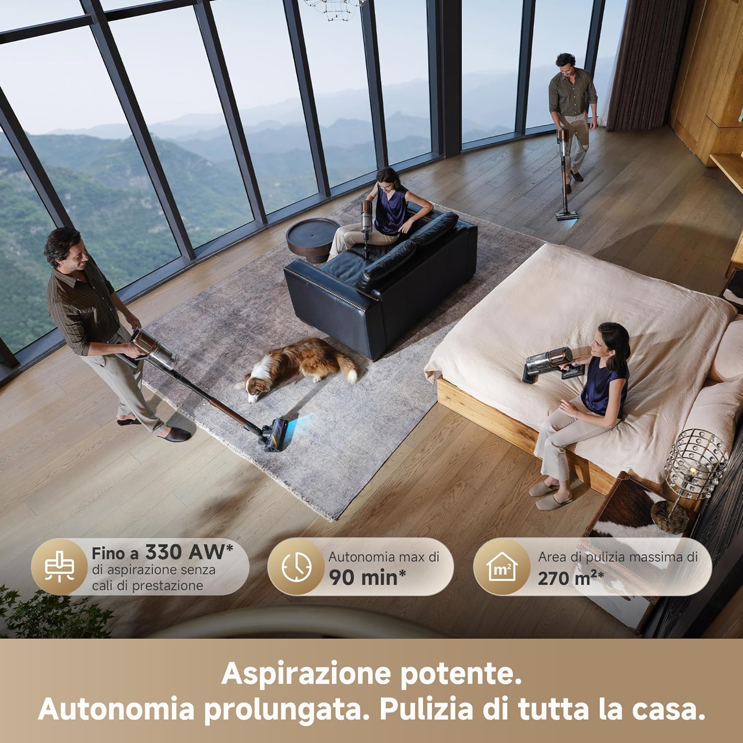 Con un’aspirazione di 330AW, il V30 si comporta in modo eccellente su qualsiasi superficie. I suoi 0.01 mm di distanza dal bordo garantiscono una pulizia approfondita anche negli angoli più difficili. È particolarmente efficace contro il pelo degli animali, rendendolo ideale per le famiglie con animali domestici.