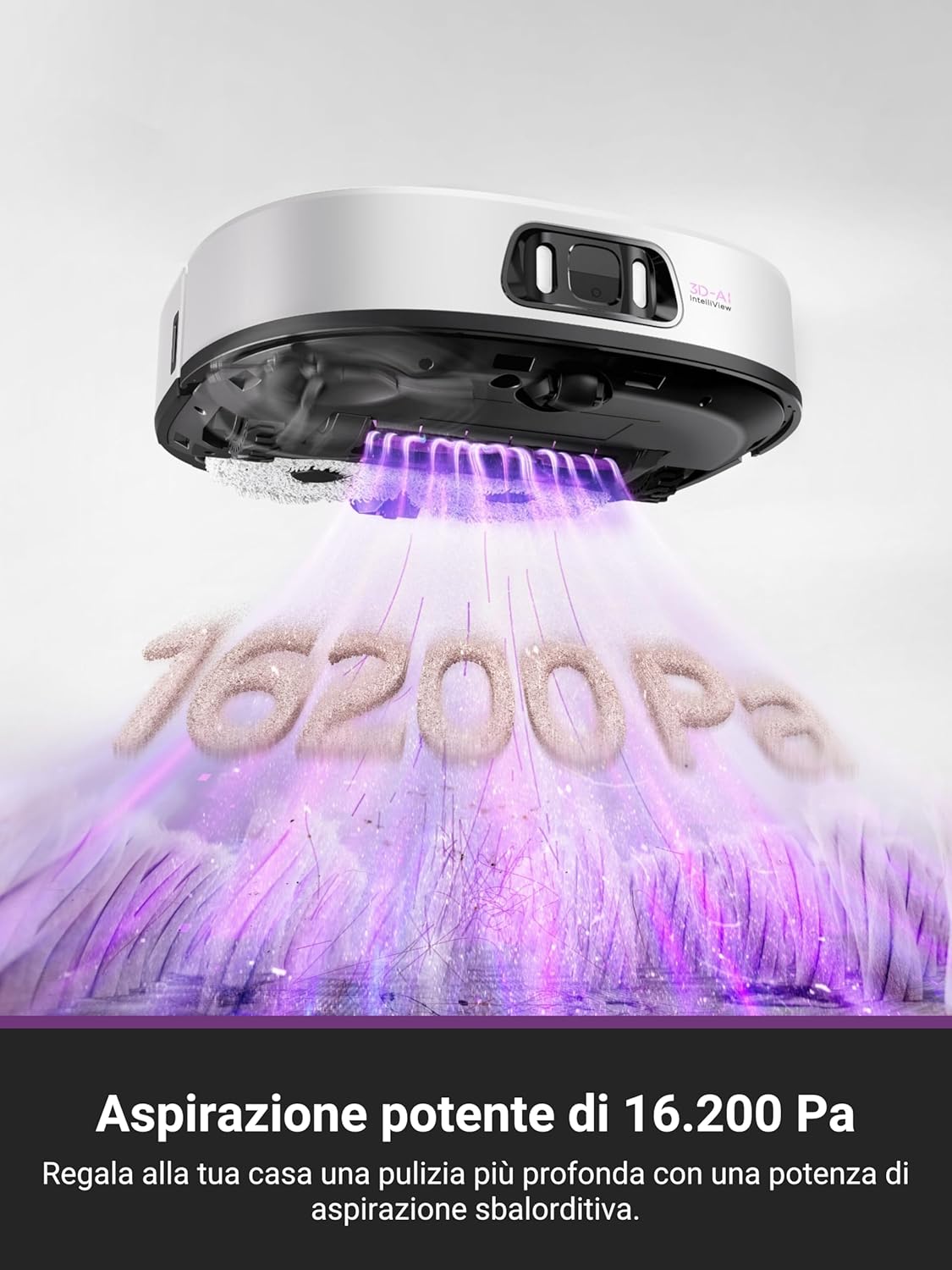 Con una potenza di aspirazione di 16200Pa, l’aspirapolvere è in grado di affrontare facilmente polvere, peli di animali e detriti vari. Testato su diverse superfici, ha dimostrato di essere efficace, anche su tappeti a pelo lungo.