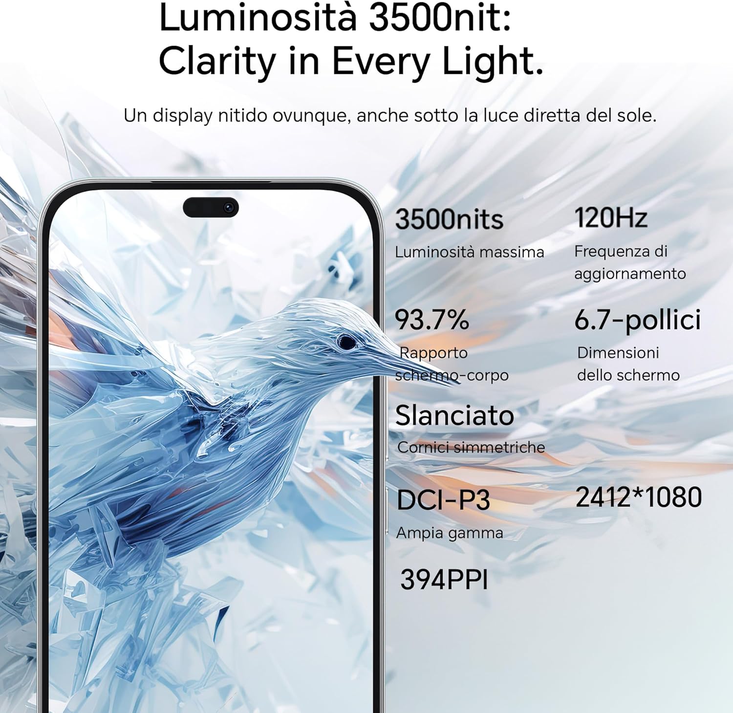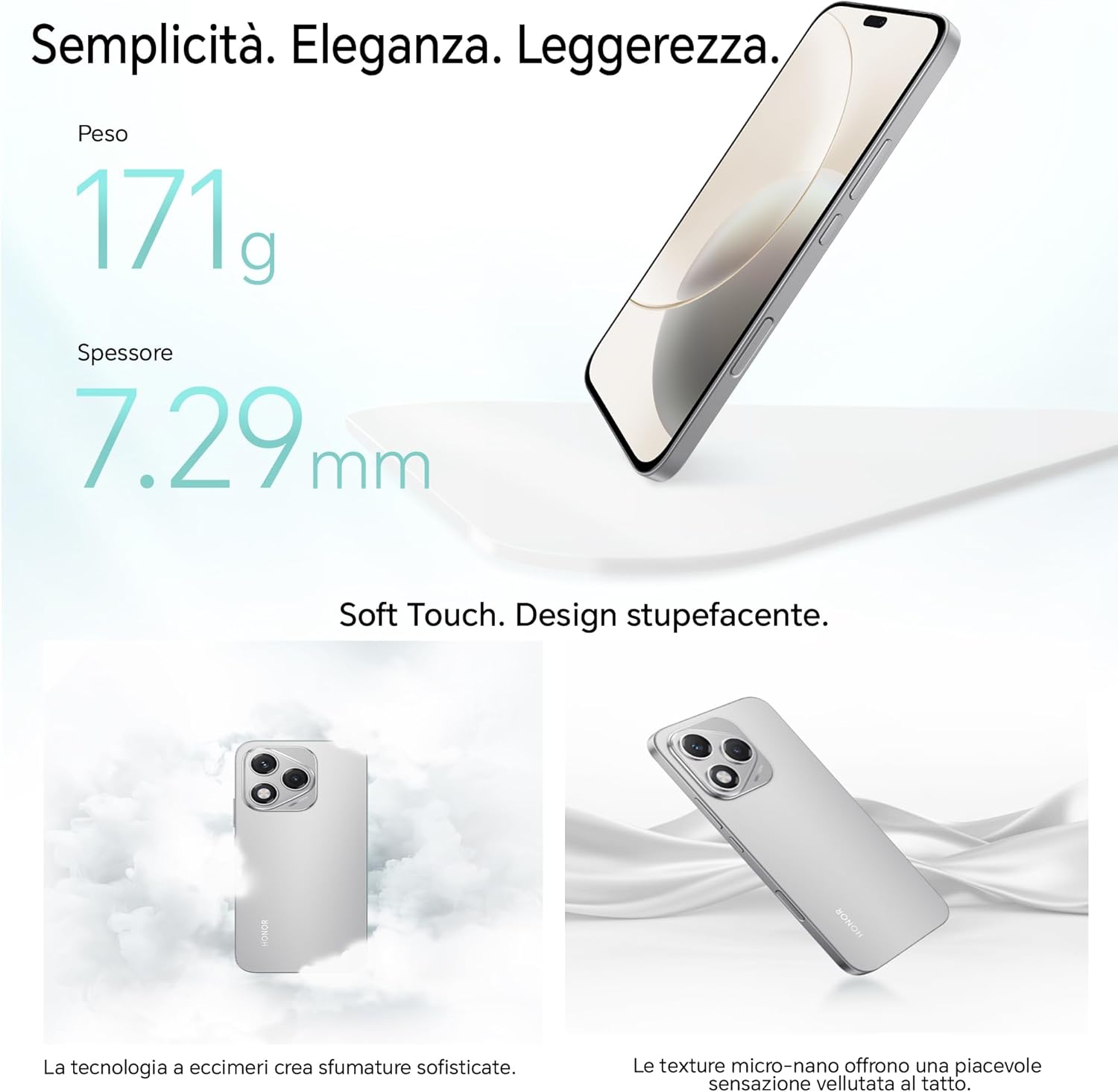 Il HONOR 400 Lite si presenta con un design elegante e moderno, caratterizzato dalla colorazione Velvet Grey. Il display AMOLED da 6.7 pollici offre colori vivaci e neri profondi, rendendo l’esperienza visiva molto gradevole, sia per la fruizione di contenuti multimediali che per la navigazione quotidiana. La tecnologia Eye-Care è un plus, particolarmente utile per chi trascorre lunghe ore davanti allo schermo.