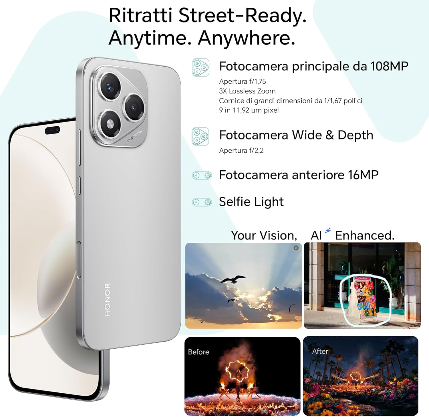 HONOR 400 Lite 5G Smartphone,8GB RAM 256GB Memoria Dual SIM NFC, 5230 mAh,108MP con pulsante AI telefono Android 15, 6.7 pollici AMOLED Eye-Care Display, IP64&SGS, Velvet Grey [Versione italiana]