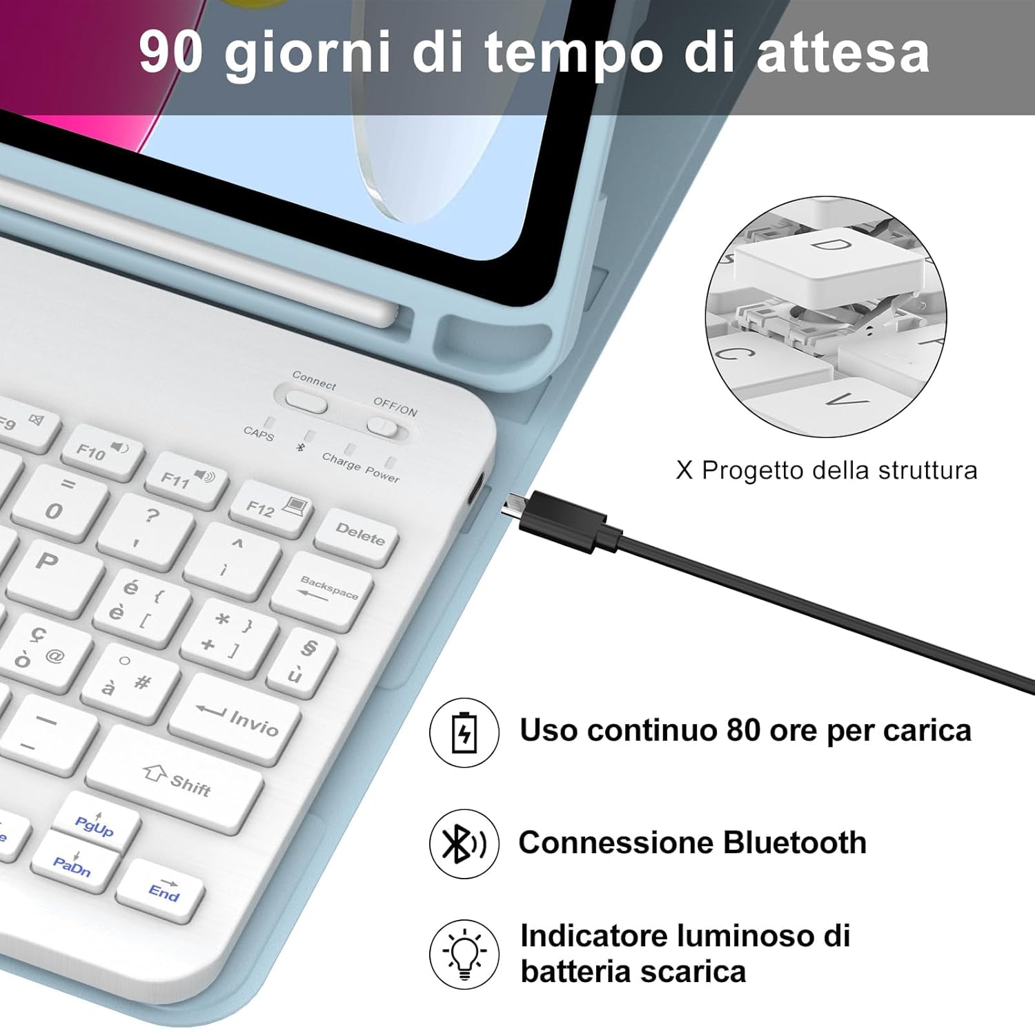 IVEOPPE Cover iPad A16 11 Generazione con Tastiera/10 Generation (11/10.9 pollici, 2025/2022), Italiano QWERTY Layout, Tastiera Bluetooth Staccabile Compatibile con iPad 11/10, Blu cielo
