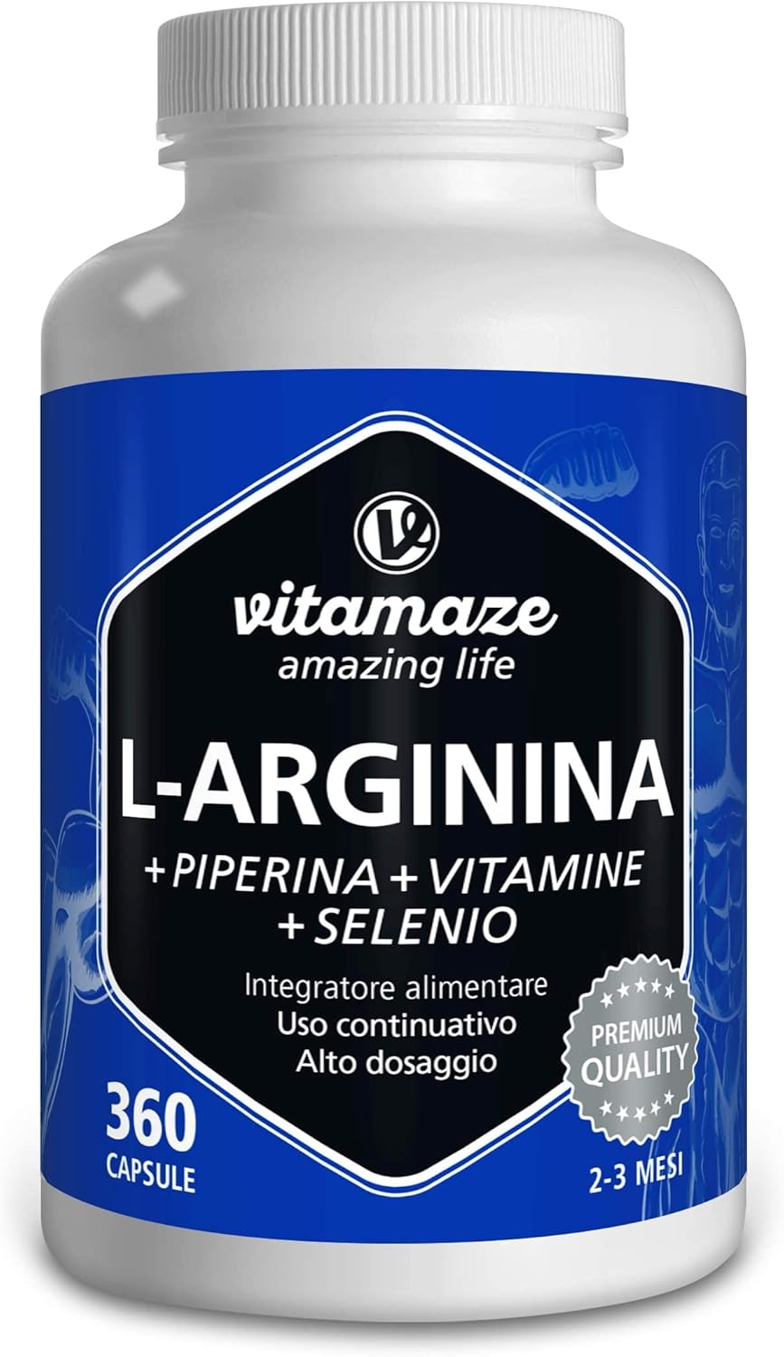 Dai un’occhiata a il prodotto L-Arginina Capsule ad Alto Dosaggio, 360 Capsule con B6, B12 + Acido Folico + Selenio + Piperina, Qualità Tedesca, Integratore Alimentare senza Additivi non Necessari, perfetto per chi cerca qualità e convenienza.