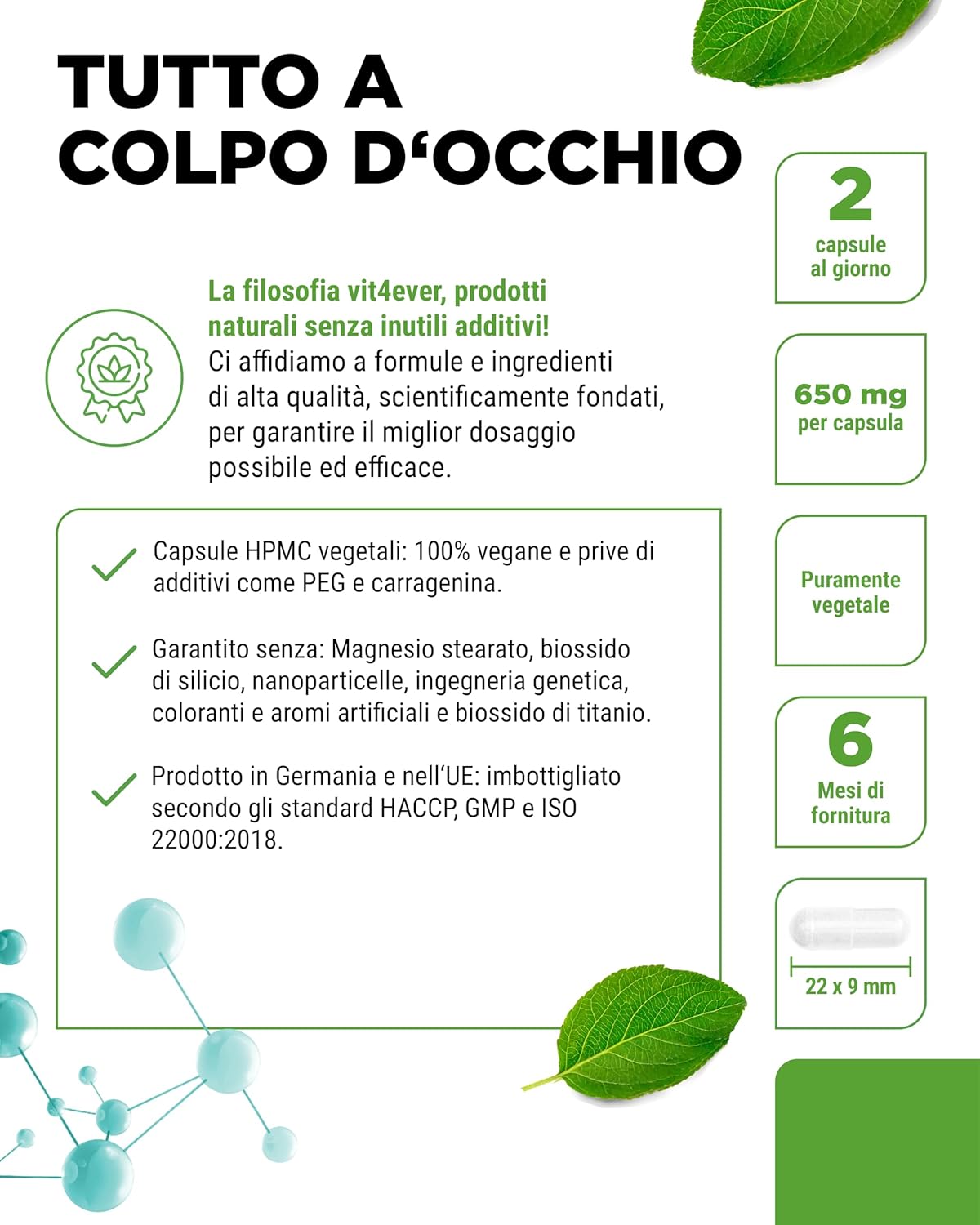 Il prodotto è offerto in una confezione contenente 365 capsule vegane, un’ottima scelta per chi cerca un integratore a lungo termine senza dover effettuare frequenti riordini. La capsula è di facile assunzione e non contiene ingredienti di origine animale, rendendola adatta anche a chi segue una dieta vegana.