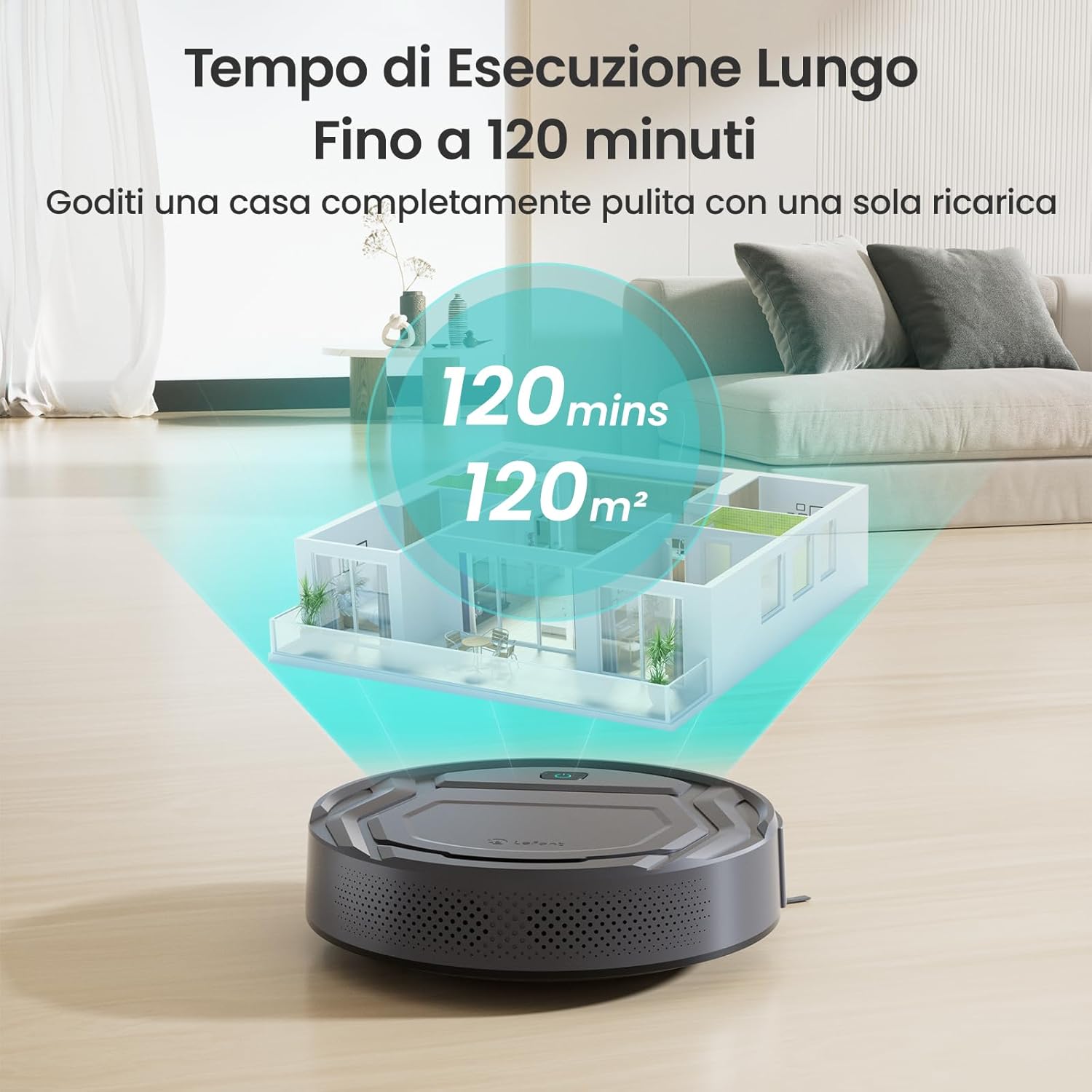 La durata della batteria è un altro punto forte: fino a 120 minuti di autonomia, sufficienti per pulire ambienti di dimensioni medio-grandi. Tuttavia, in spazi più ampi potrebbero essere necessarie più ricariche.