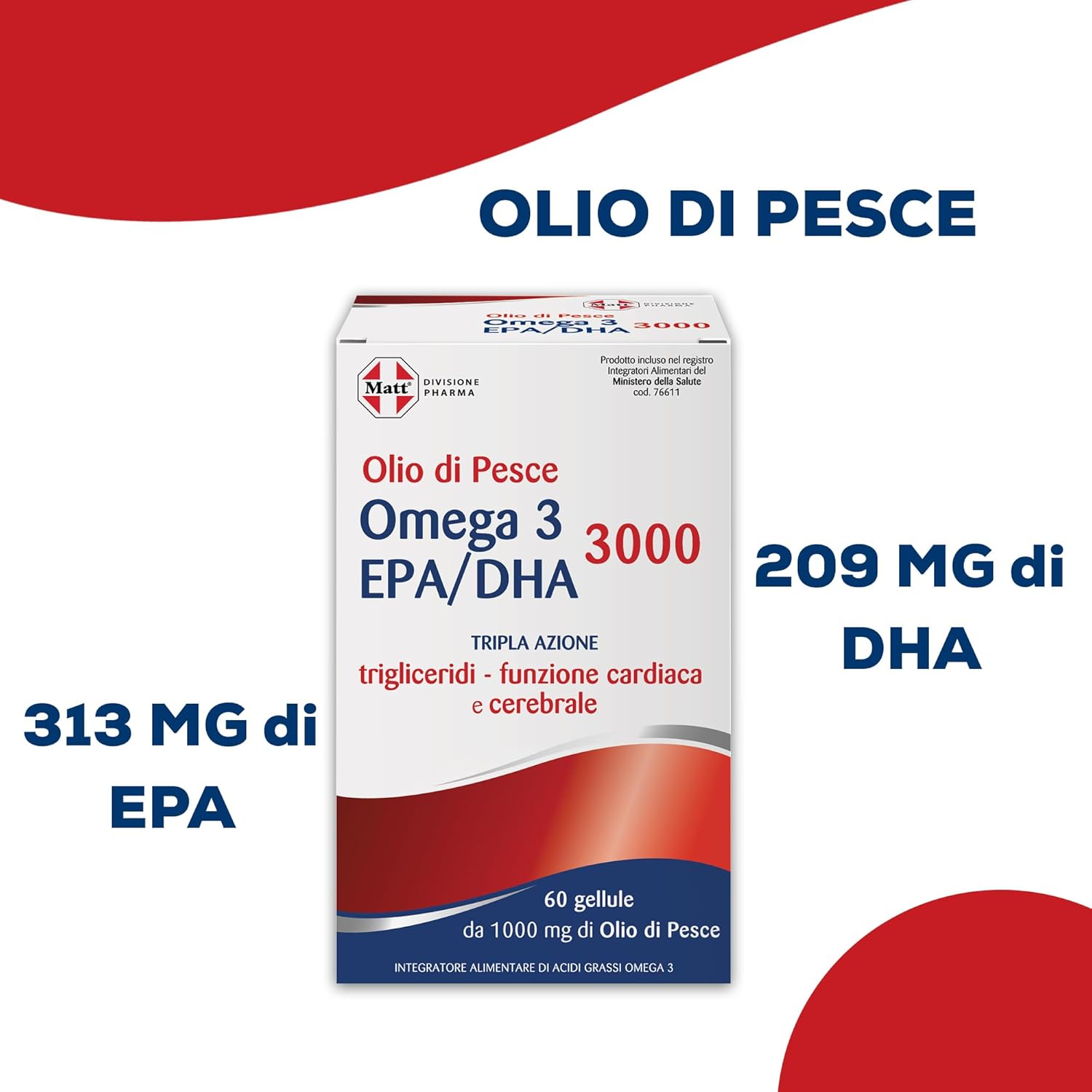 Matt, Olio di Pesce Omega 3 EPA/DHA 3000, Integratore Alimentare Utile per la Funzione Cardiaca e Celebrale, Confezione da 60 Gellule