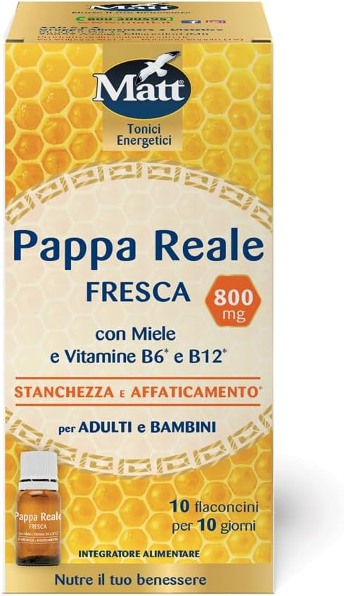 Scopri il prodotto Matt, Pappa Reale Fresca, Integratore Alimentare Ricca di Nutrienti con Vitamina B6 e B12, Senza Glutine, Contribuisce alla Riduzione della Stanchezza e dell’Affaticamento, 10 Flaconcini da 8 ml, adatto per chi cerca qualità e convenienza.