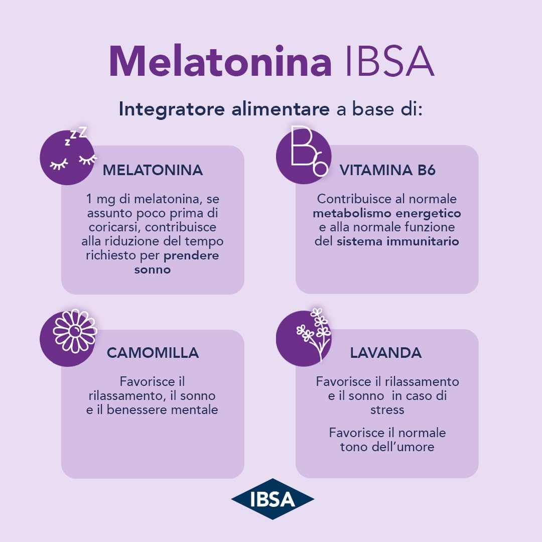 La Melatonina IBSA in formato film orodispersibili da 30 compresse è un integratore alimentare particolarmente interessante per chi ha difficoltà ad addormentarsi. La melatonina è nota per il suo ruolo nel regolare il ciclo sonno-veglia, e in questo prodotto è associata alla Vitamina B6, che contribuisce al normale funzionamento del sistema nervoso.
