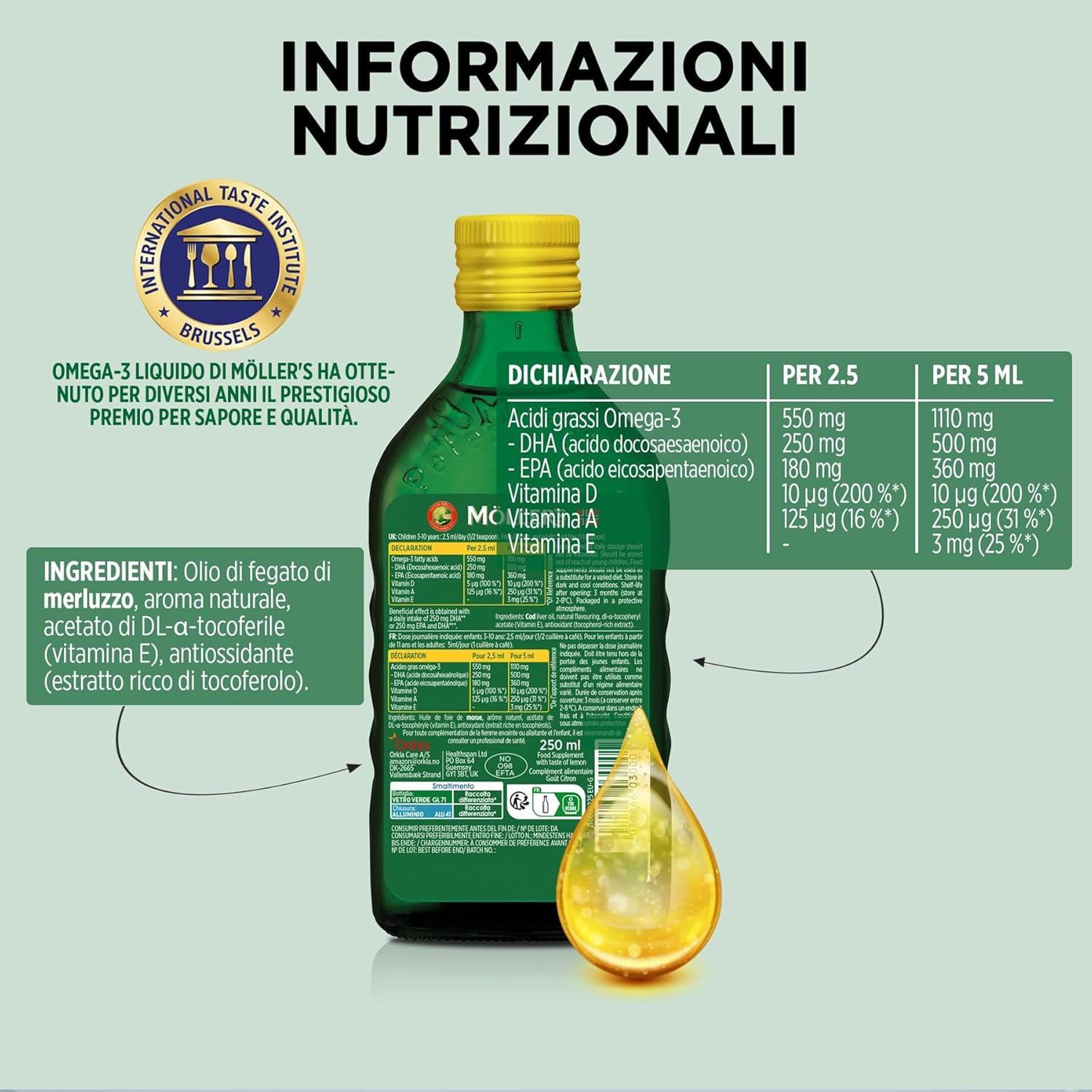 Moller’s Olio di fegato di merluzzo è un integratore alimentare che offre un’ottima fonte di Omega-3, con acidi grassi EPA e DHA, oltre a vitamine A, D ed E. Con una tradizione di 166 anni, il marchio gode di una certa reputazione, e il premio “Superior Taste Award” suggerisce un’attenzione particolare alla qualità.