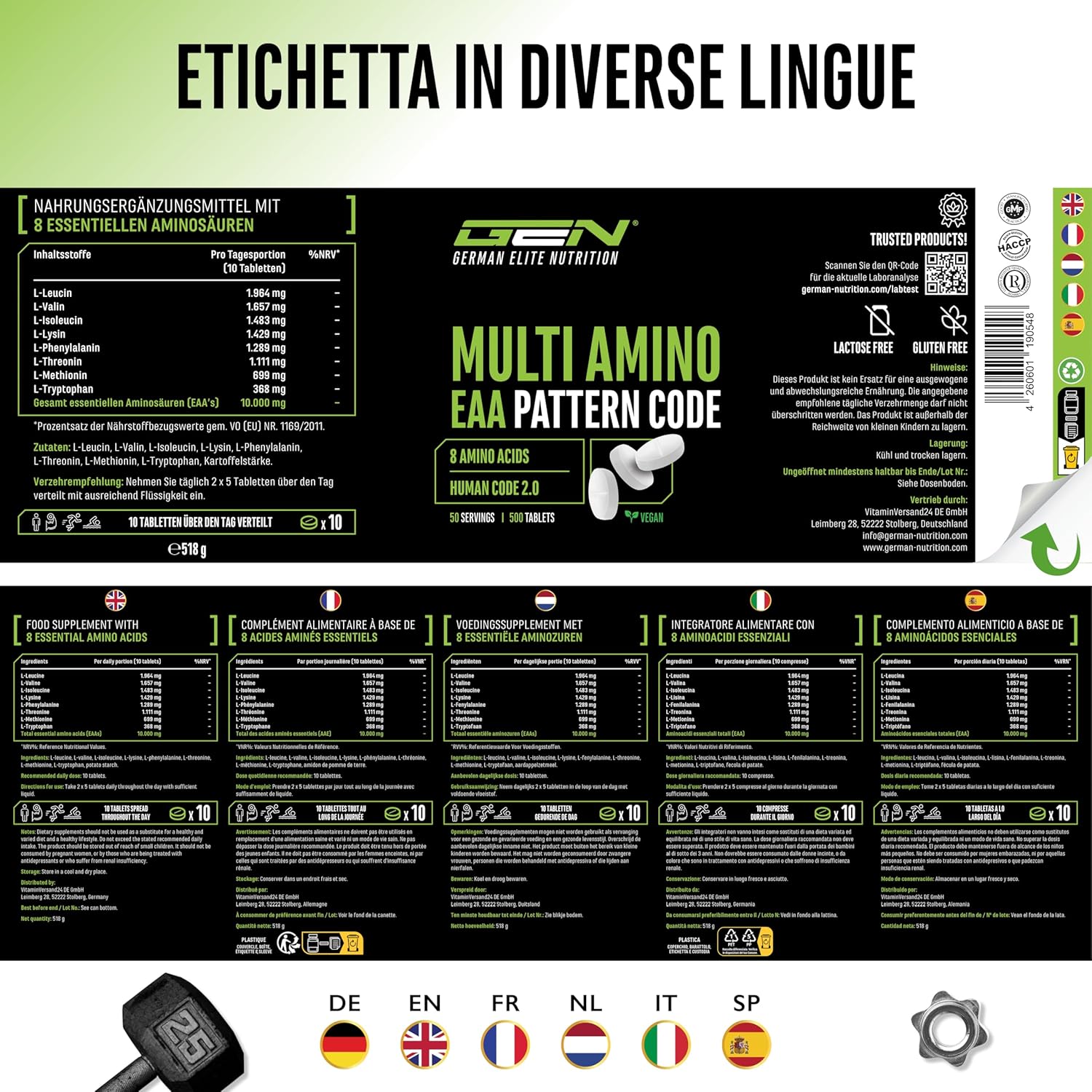 Esplora il prodotto Multi Amino-EAA Pattern Code – 500 compresse da 1000 mg ciascuna – Formula Human Code – Tutti gli 8 aminoacidi essenziali – Da fermentazione vegetale – Alto dosaggio – Vegan, ideale per chi cerca qualità e convenienza.