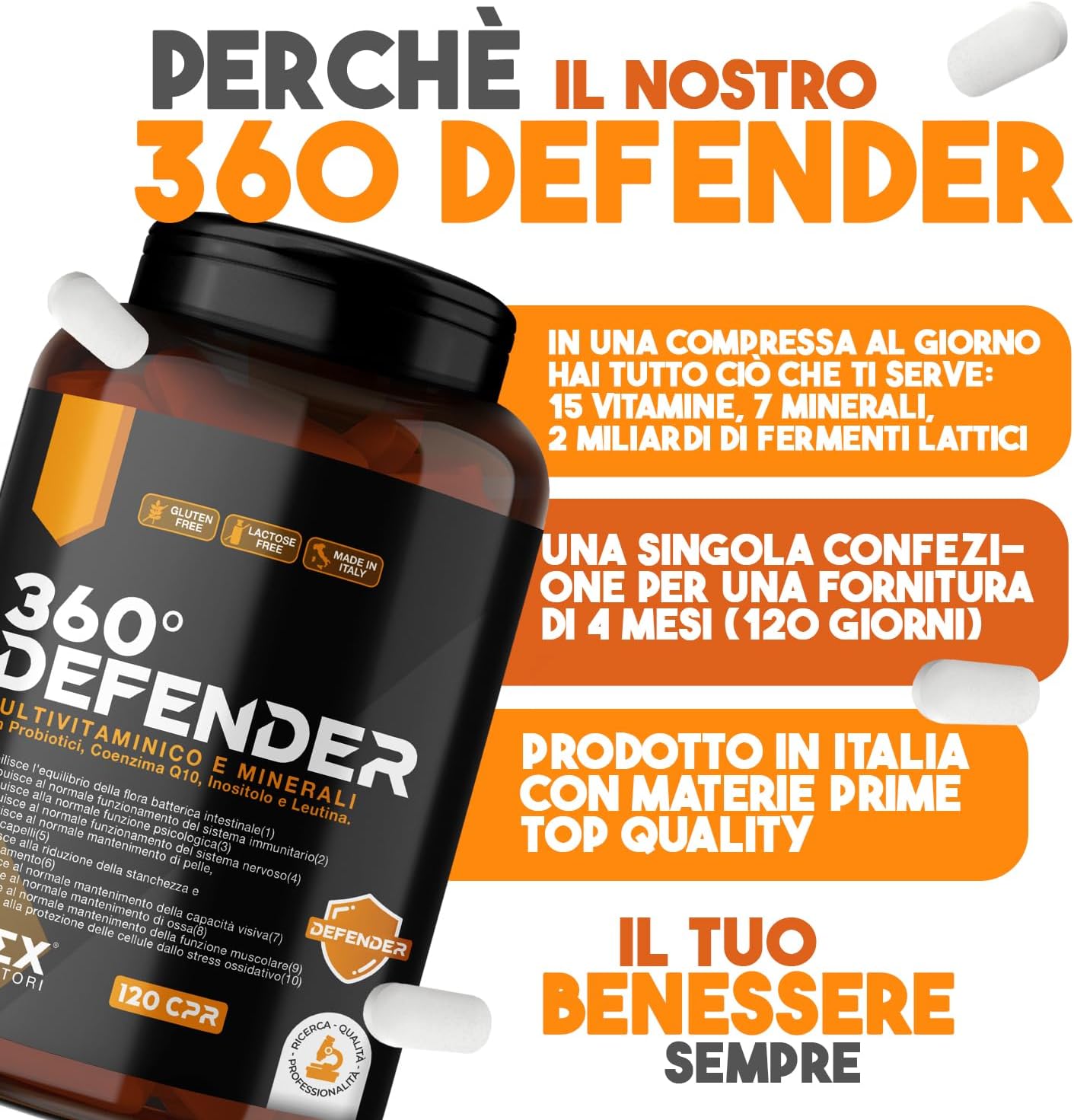 Il "360° Defender" è un integratore multivitaminico e multiminerale che promette di supportare il benessere generale grazie alla sua formula ricca e variegata. È composto da 14 vitamine essenziali e 5 sali minerali, arricchito con probiotici, vitamina B12, acido folico e coenzima Q10.
