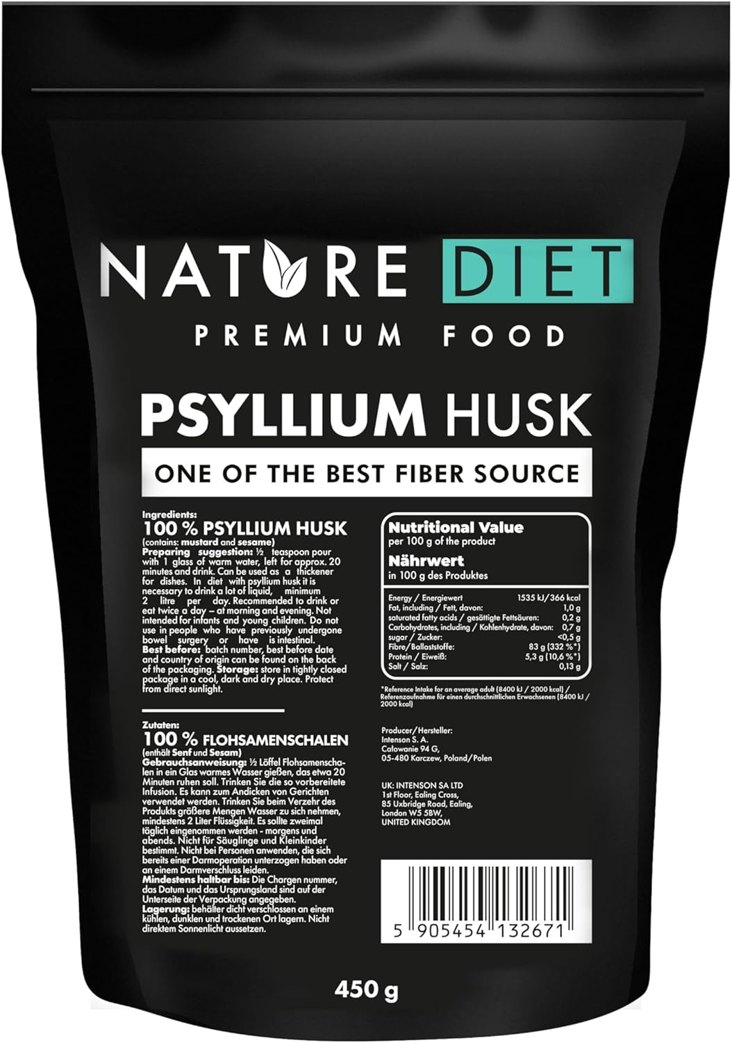 Nature Diet Bucce di Psillio | 450 g | Ricco di Fibre | Vegano, Senza Glutine & Senza Lattosio | Per Dieta Keto & Low-Carb | Ideale per Bevande & Ricette, 450g