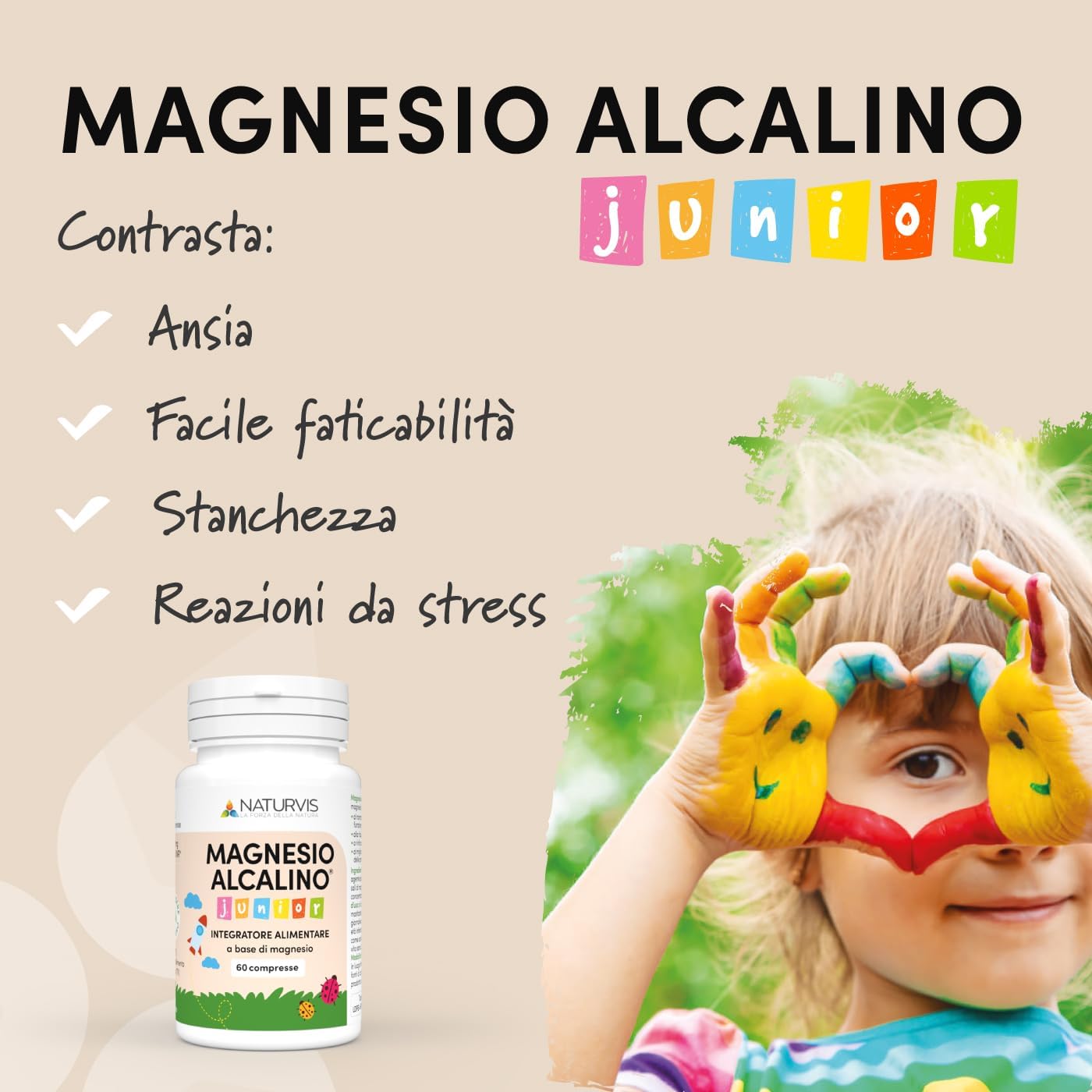 NATURVIS MAGNESIO JUNIOR – Integratore di Magnesio Naturale per Bambini – Supporto Energetico, Crescita e Sonno – Ottimo Sapore – 60 Compresse Masticabili – Alta qualità, Made in Italy