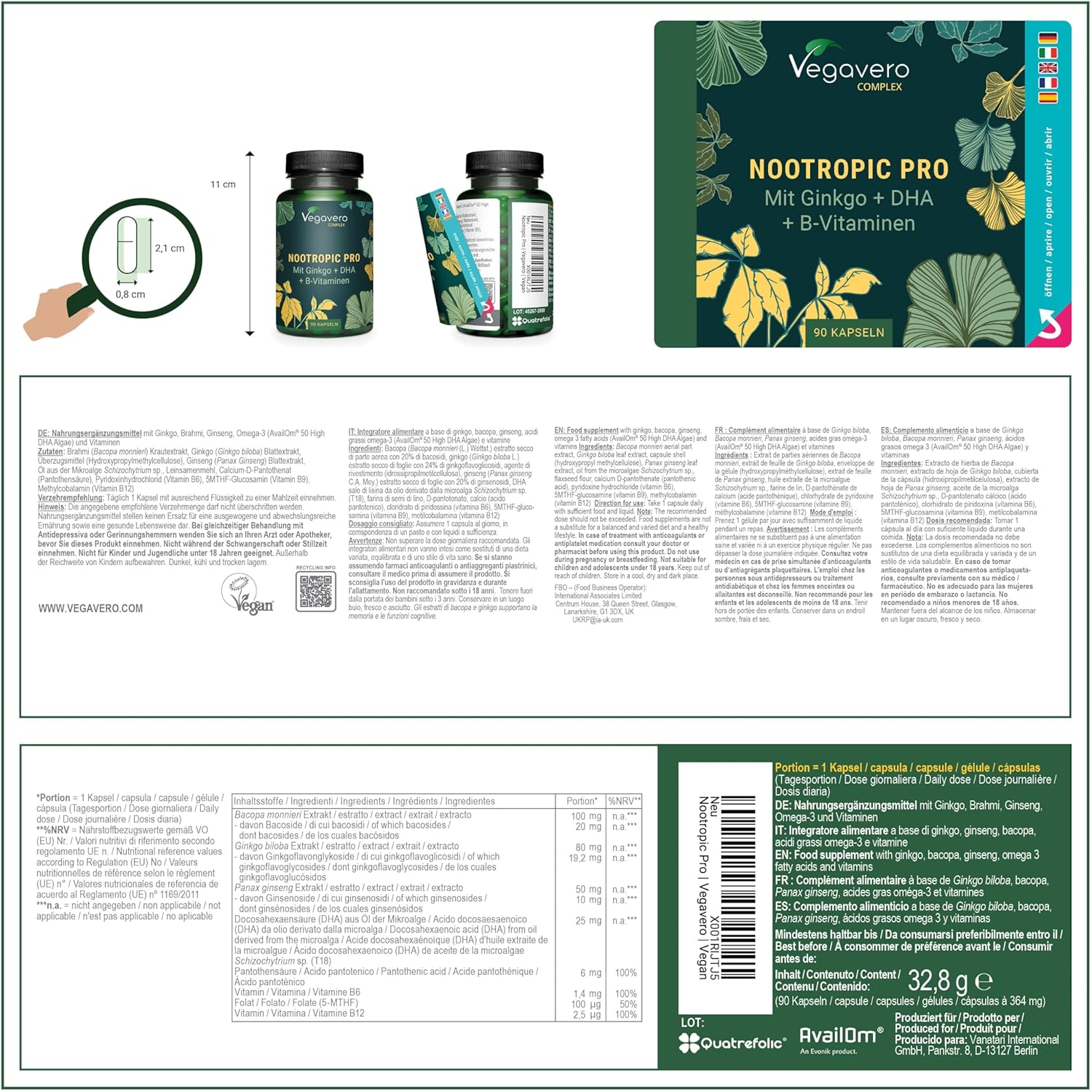 NOOTROPICO Potente | con Ginkgo Biloba, Bacopa Monnieri, Ginseng e Omega 3 | Nootropic per Memoria e Concentrazione | senza Additivi e senza Caffeina | 90 capsule (3 mesi) | Vegan | Vegavero®