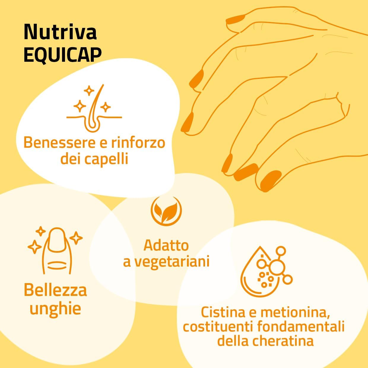 NUTRIVA Equicap si presenta come un integratore alimentare promettente, specificatamente formulato per supportare la salute di capelli e unghie. La sua composizione include ingredienti come il bamboo, zinco, ferro, vitamina C e un complesso di vitamine del gruppo B, tutti noti per le loro proprietà benefiche.