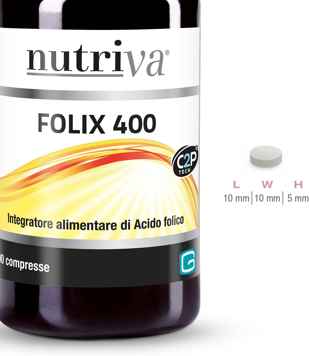 NUTRIVA Folix 400, Integratore alimentare a base di Acido Folico. Integratore per donne, utile per stanchezza e affaticamento. Utile in gravidanza. 100 compresse. C2P® Tech