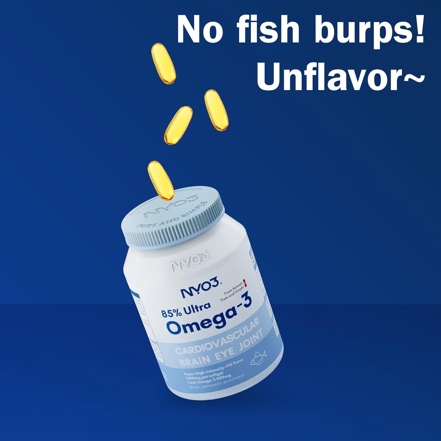 Scopri il prodotto NYO3 Olio di Pesce Omega 3 2000mg (800mg EPA, 600mg DHA), 85% di alta potenza. Acidi grassi essenziali per cuore, cervello e articolazioni. Senza retrogusto pescato, Non OGM, 60 capsule, ideale per chi cerca qualità e convenienza.