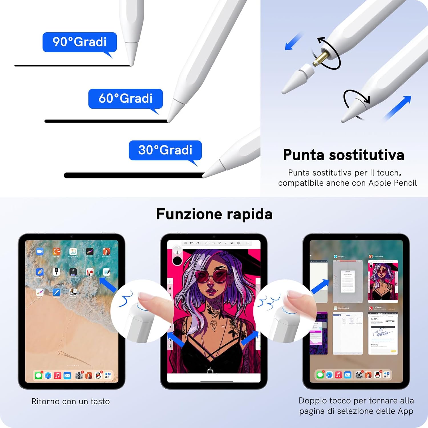 Esplora il prodotto Penna iPad Compatibile con Apple iPad 2018-2024, Penna per iPad con Palm Rejection e Ricarica Wireless,iPad 6~10th、iPad Air 3~5th、iPad Mini 5/6th、iPad Pro 11′ 1~4th、iPad Pro 12.9 3~6th, adatto per chi cerca qualità e convenienza.