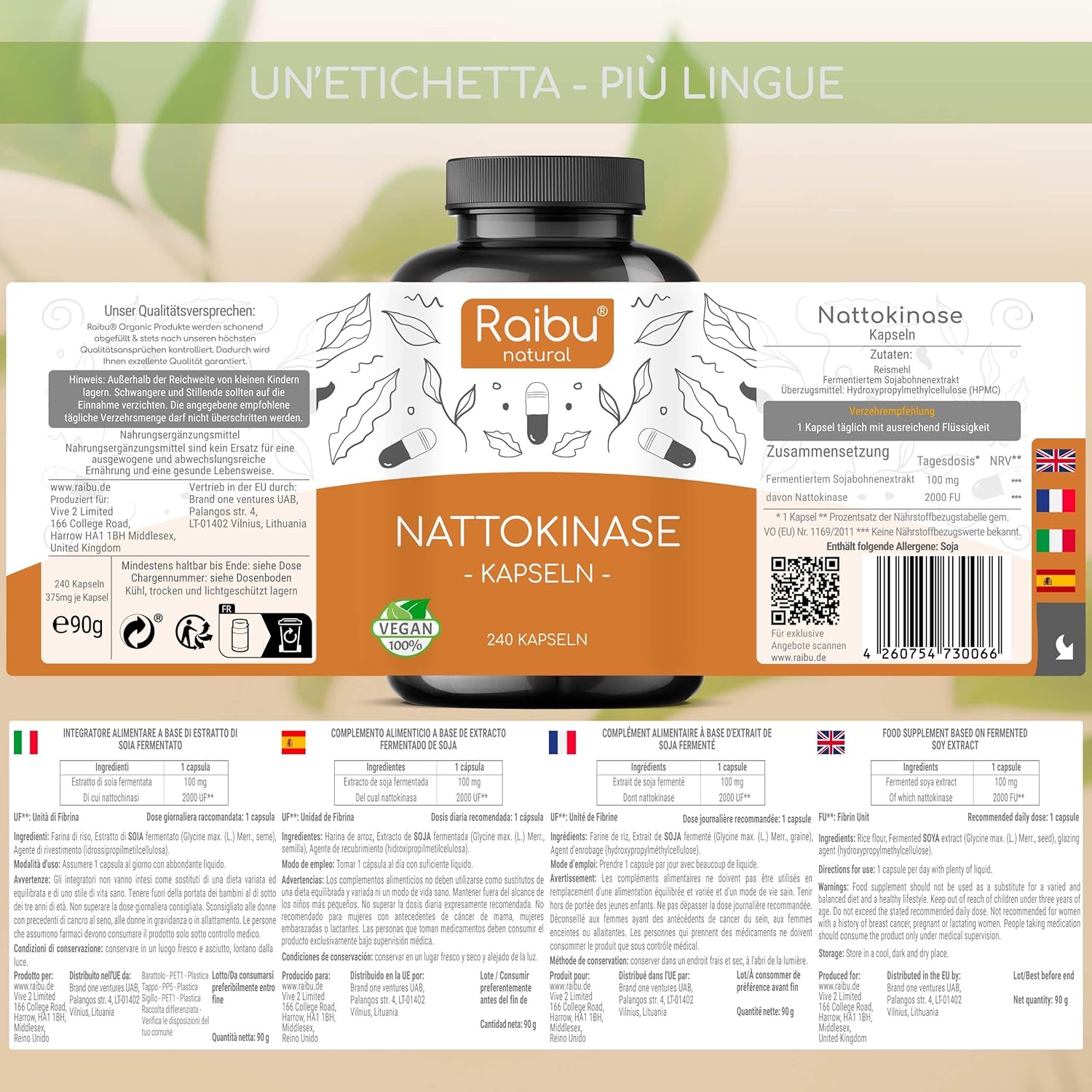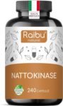 Raibu Nattokinase 240 Capsule – Alto Dosaggio 100 mg (Nattokinase 20.000 FU/g) – 8 Mesi di Fornitura – Testato in Laboratorio e Vegano – Natto Giapponese da Soia – Senza Additivi