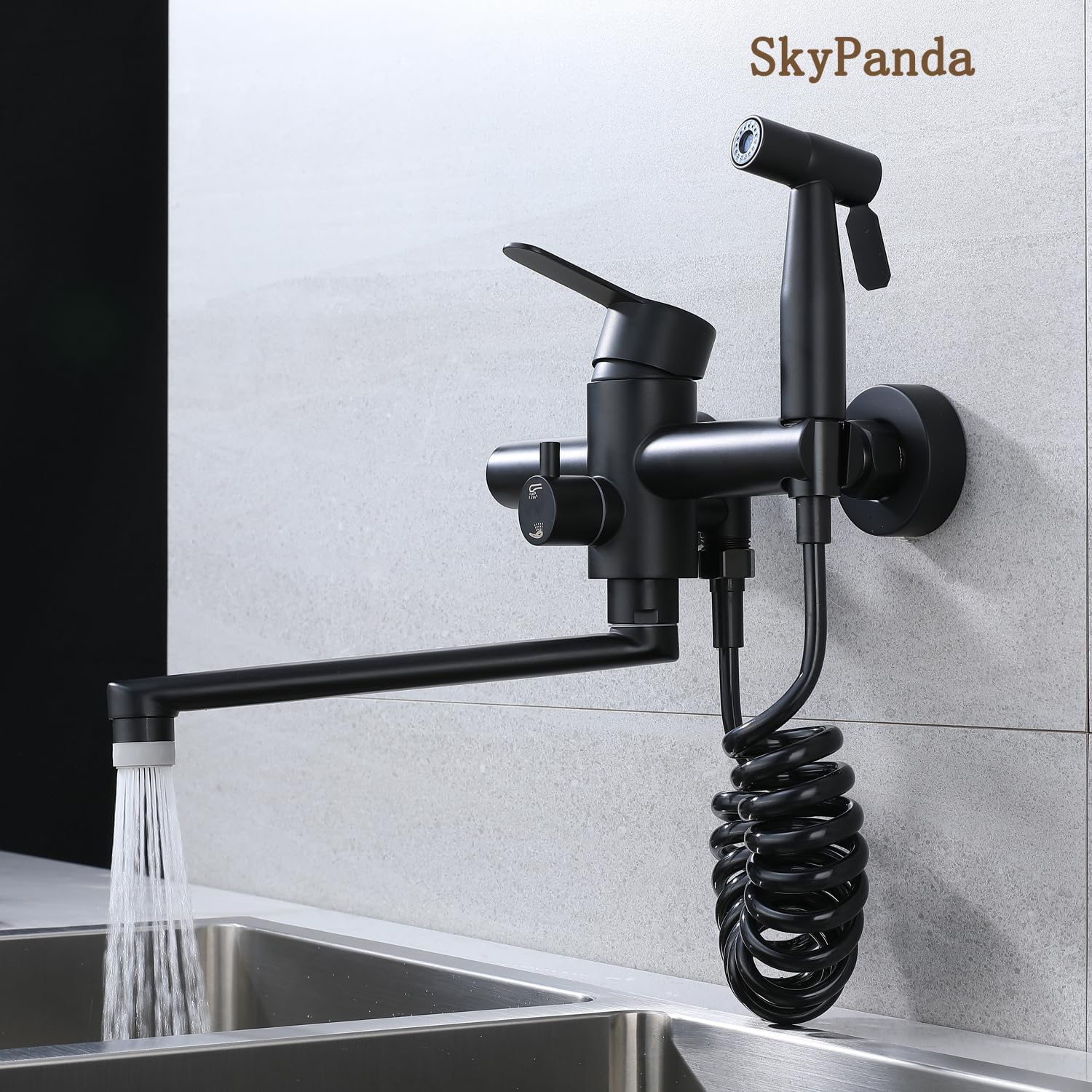 Rubinetto da cucina, montaggio a parete, da cucina con pistola a spruzzo, girevole a 360°, tubo girevole da 23 cm, caldo e freddo, 4 modalità di funzionamento, acciaio inox 304, nero