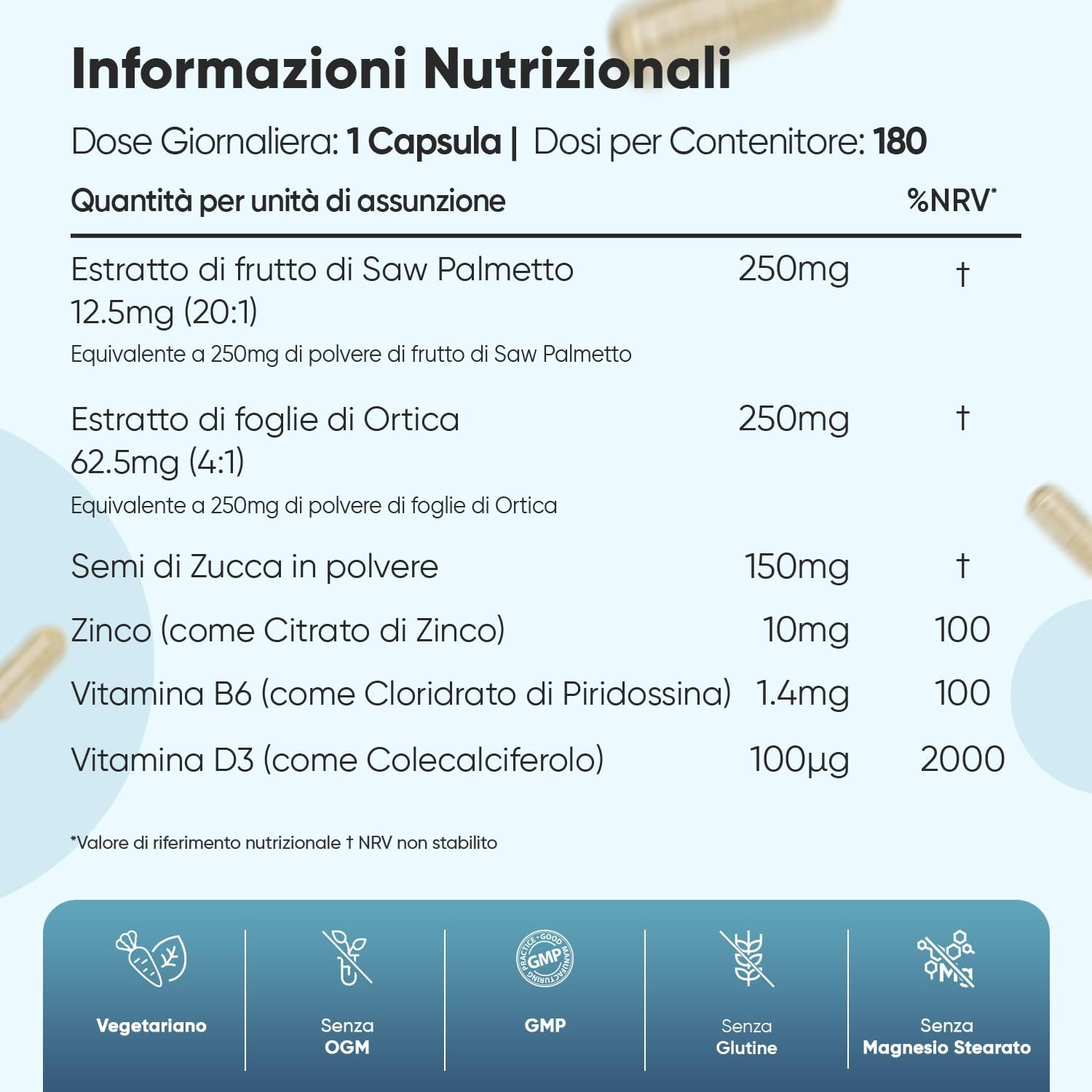 Il blend di ingredienti è un punto forte di questo prodotto. L’estratto di Saw Palmetto (Serenoa Repens) è ben noto per le sue proprietà benefiche protratte nel tempo, specialmente per la salute prostatica. L’aggiunta di semi di zucca, ortica in polvere, zinco, vitamina D3 e vitamina B6 contribuisce a un approccio sinergico e completo. Questi ingredienti possono offrire supporto non solo per la prostata, ma anche per il sistema immunitario e il benessere generale.