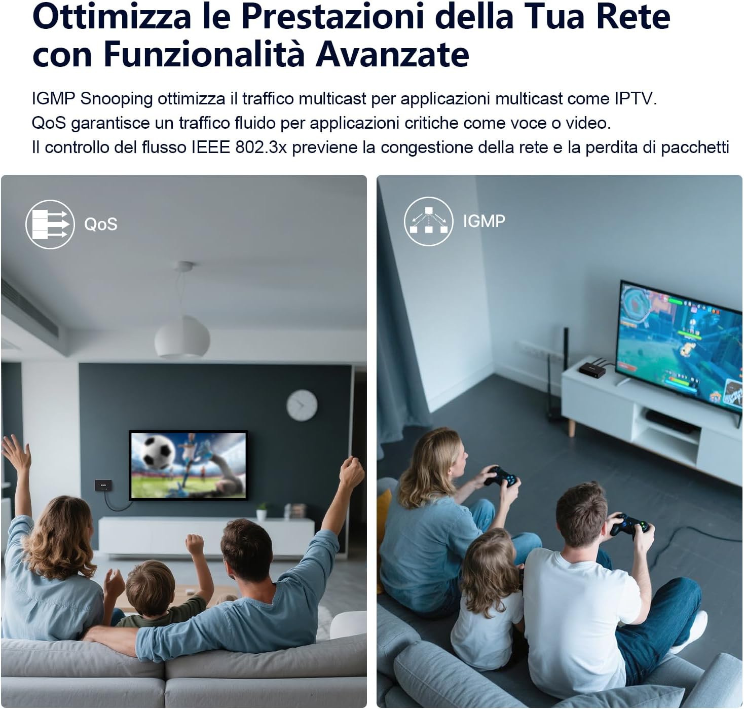 Il supporto per IGMP Snooping e QoS (802.1p/DSCP) garantisce una gestione efficace del traffico, migliorando la qualità della trasmissione dati e riducendo la latenza, particolarmente utile per applicazioni come lo streaming video o i videogiochi online. Le prestazioni sono stabili e senza interruzioni, anche sotto carico.