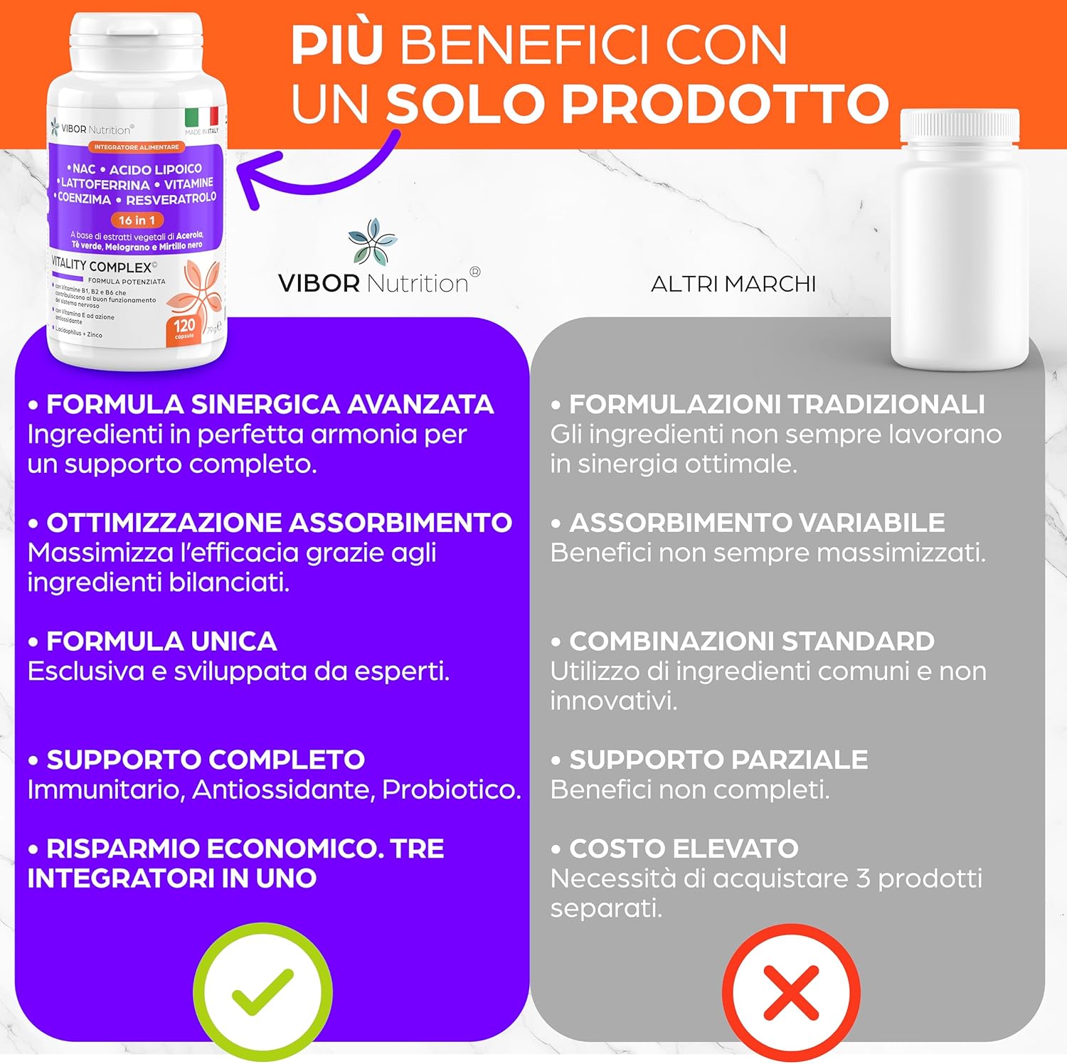 In mega sconto il prodotto Vibor Vitality Complex 120 Cps Integratore 3 in 1 Con NAC N-Acetil-Cisteina, 16 Ingredienti, Difese Immunitarie Adulti, Fermenti Lattici Probiotici, Lattoferrina,Vitamina C B1 B2 B6,Acido Alfa Lipoico, ideale per chi cerca qualità e convenienza.