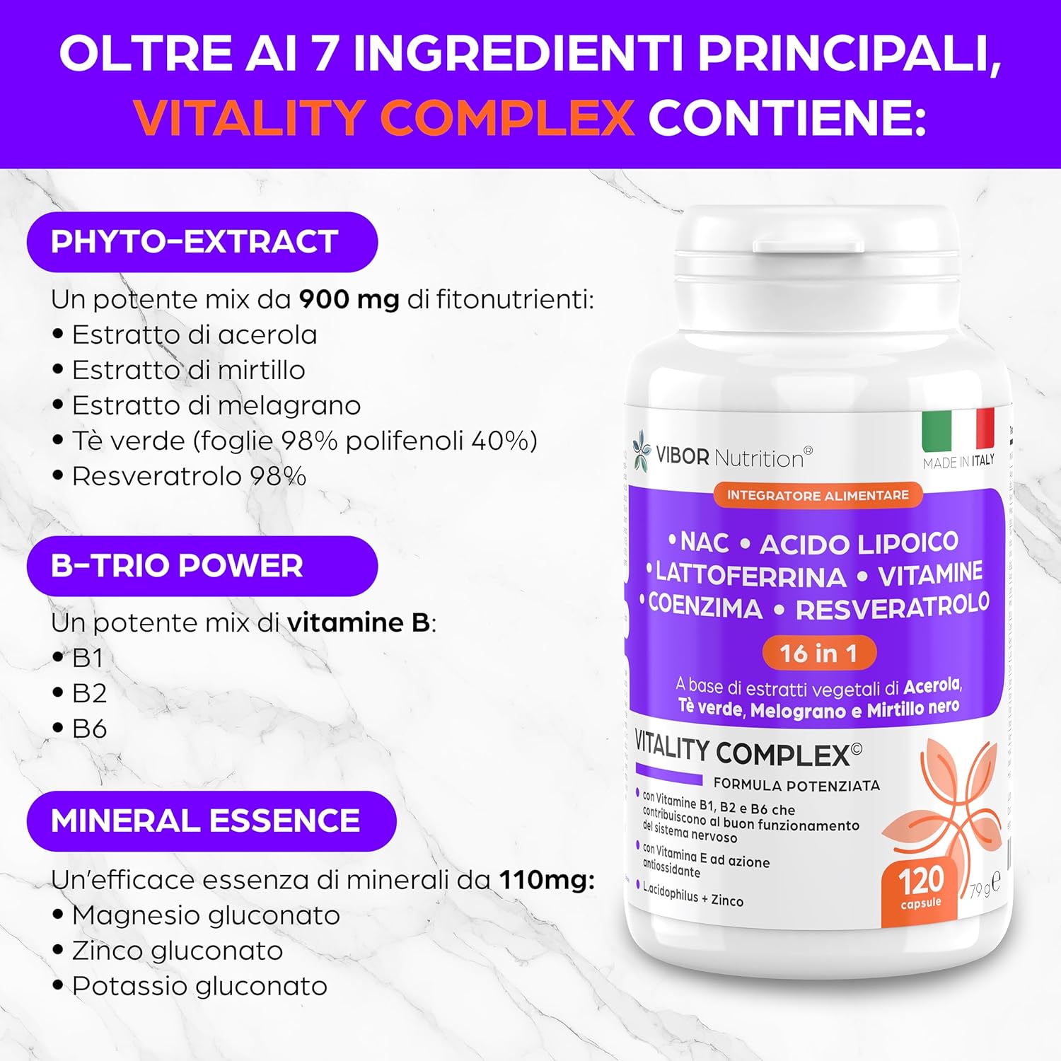 Vibor Vitality Complex 120 Cps Integratore 3 in 1 Con NAC N-Acetil-Cisteina, 16 Ingredienti, Difese Immunitarie Adulti, Fermenti Lattici Probiotici, Lattoferrina,Vitamina C B1 B2 B6,Acido Alfa Lipoico