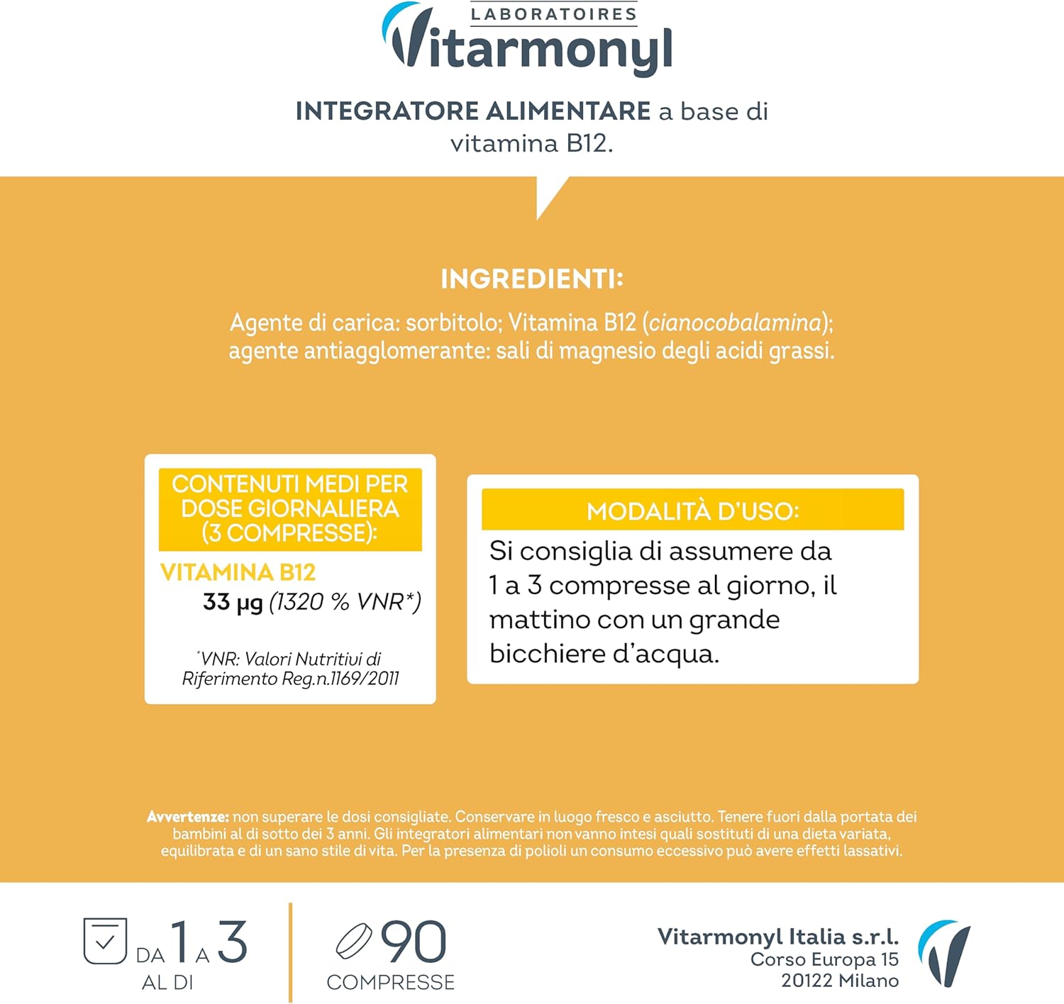 Vitamina B12 – Integratore Alimentare per il Metabolismo Energetico – Per il normale funzionamento del Sistema Immunitario – Integratori Stanchezza – Confezione da 90 compresse – Vitarmonyl