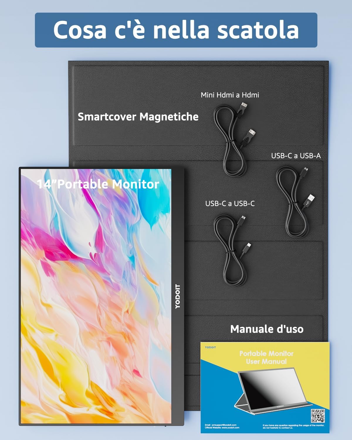Il monitor portatile Yodoit da 14 pollici è un dispositivo progettato per offrire una buona esperienza visiva, con una risoluzione di 1920 × 1080 FHD e un display IPS che garantisce angoli di visione ampi. Ecco alcuni aspetti chiave da considerare: